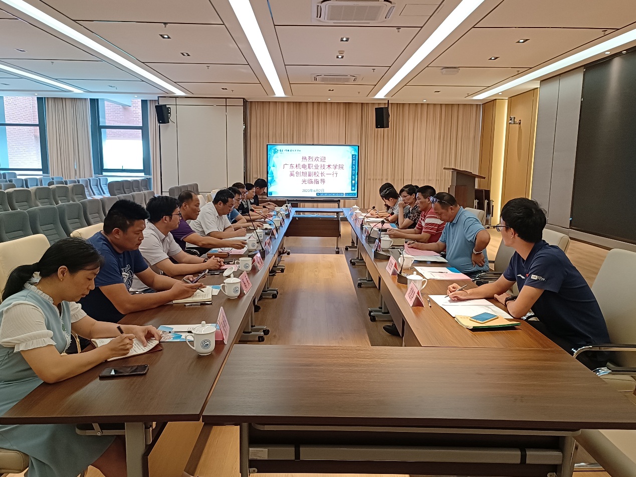 2023年6月2日下午,广东机电职业技术学院奚创旭一行9人来校参观交流。学校党委委员、副校长唐毓秋热情接待了奚创旭副校长一行。