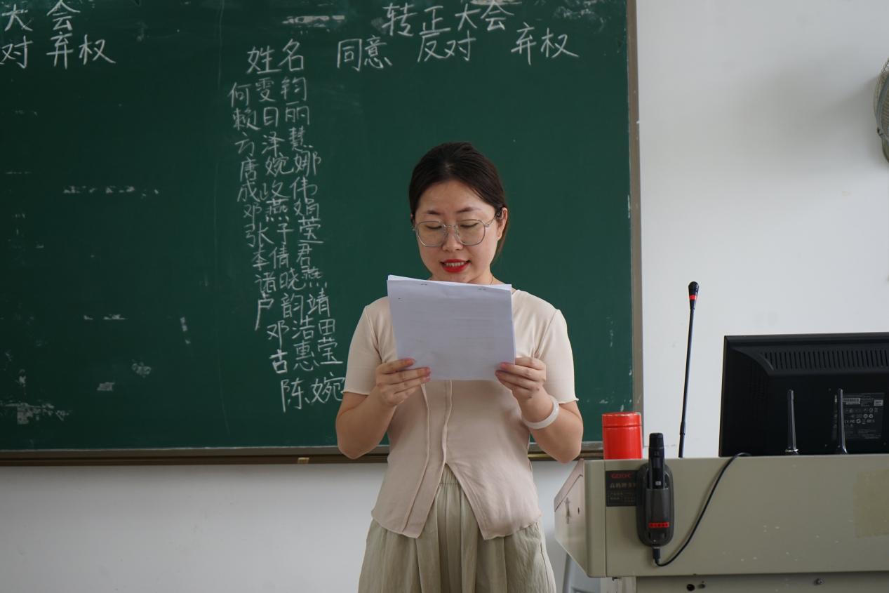 为进一步加强党员队伍建设,增强党员队伍的生机和活力,夯实战斗堡垒根基,激发党员奋进力量,2023年6月9日下午,应用外语学院学生第一党支部、第二党支部分别于于明德楼1-201、2-603召开预备党员转正大会暨接收预备党员通表大会。学生第一党支部书记陈晓玲、支委林耀佳、李迪;学生第二党支部书记王燕玲,支委冯锐骐、教师党员谭璇、许瑞如出席会议,支部全体学生党员参加了本次大会。