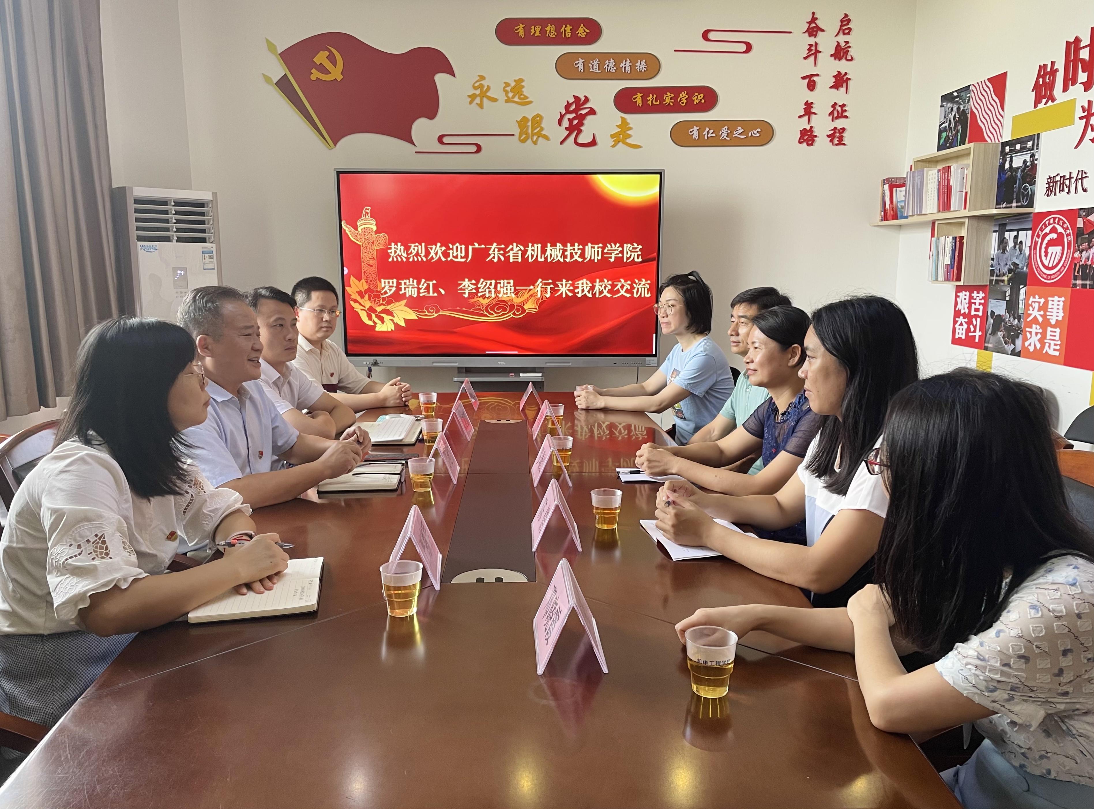 为深入开展学习贯彻习近平新时代中国特色社会主义思想主题教育,切实加强基层党组织党建工作交流,6月15日下午2点,广东省机械技师学院在塘贝校区党办主任罗瑞红、党办副主任李绍强带领下一行5人到我院教师第一党支部调研学习,我院党总支书记邵超城、党总支副书记梁超鹏等4人参加交流。
