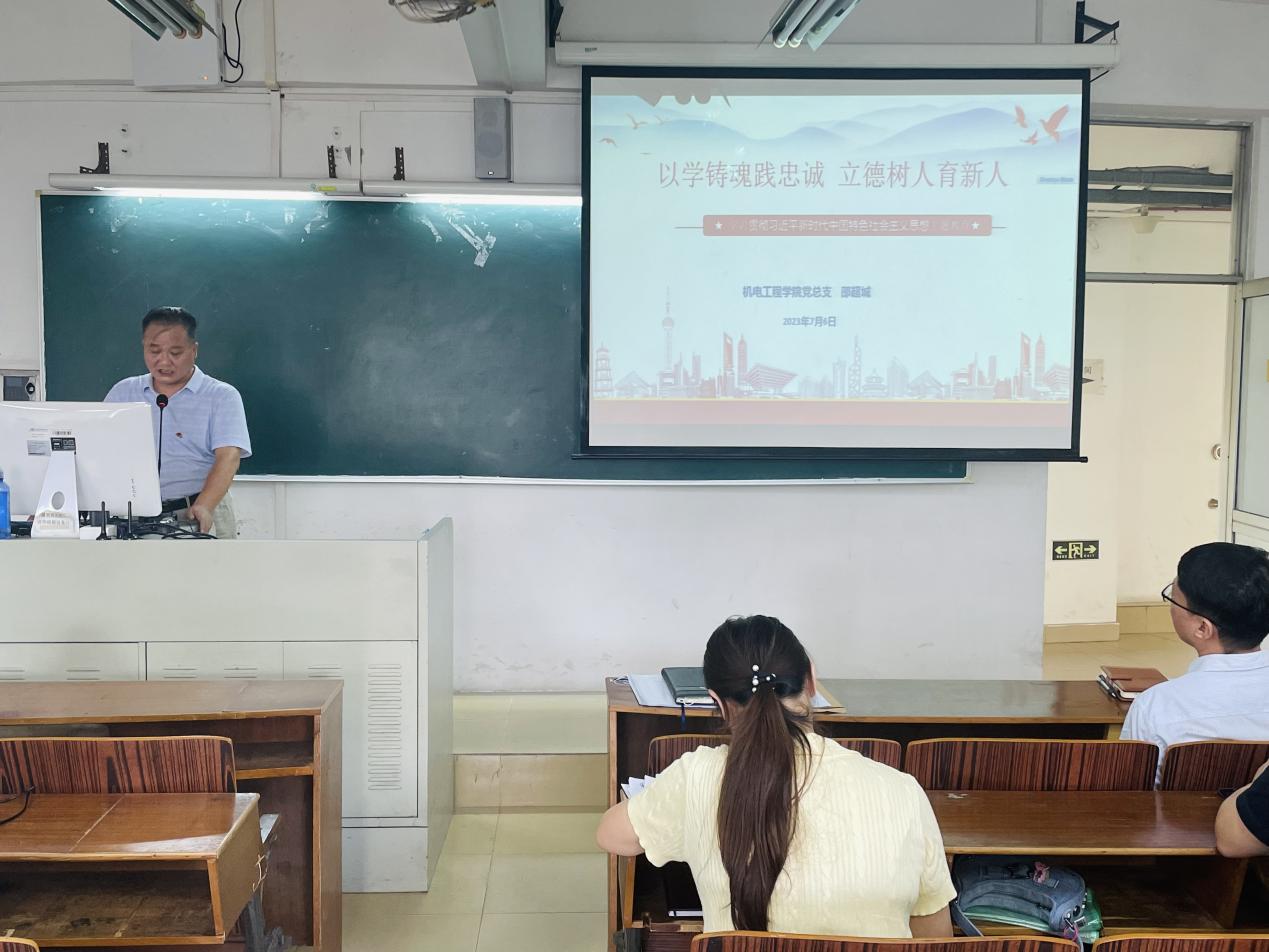 机电工程学院党总支于7月6日下午3点,党总支书记邵超城在天河校区西区综合楼406室开展以“以学铸魂践忠诚 立德树人育新人”为主题的党课学习,机电学院全体教师党员参加学习。