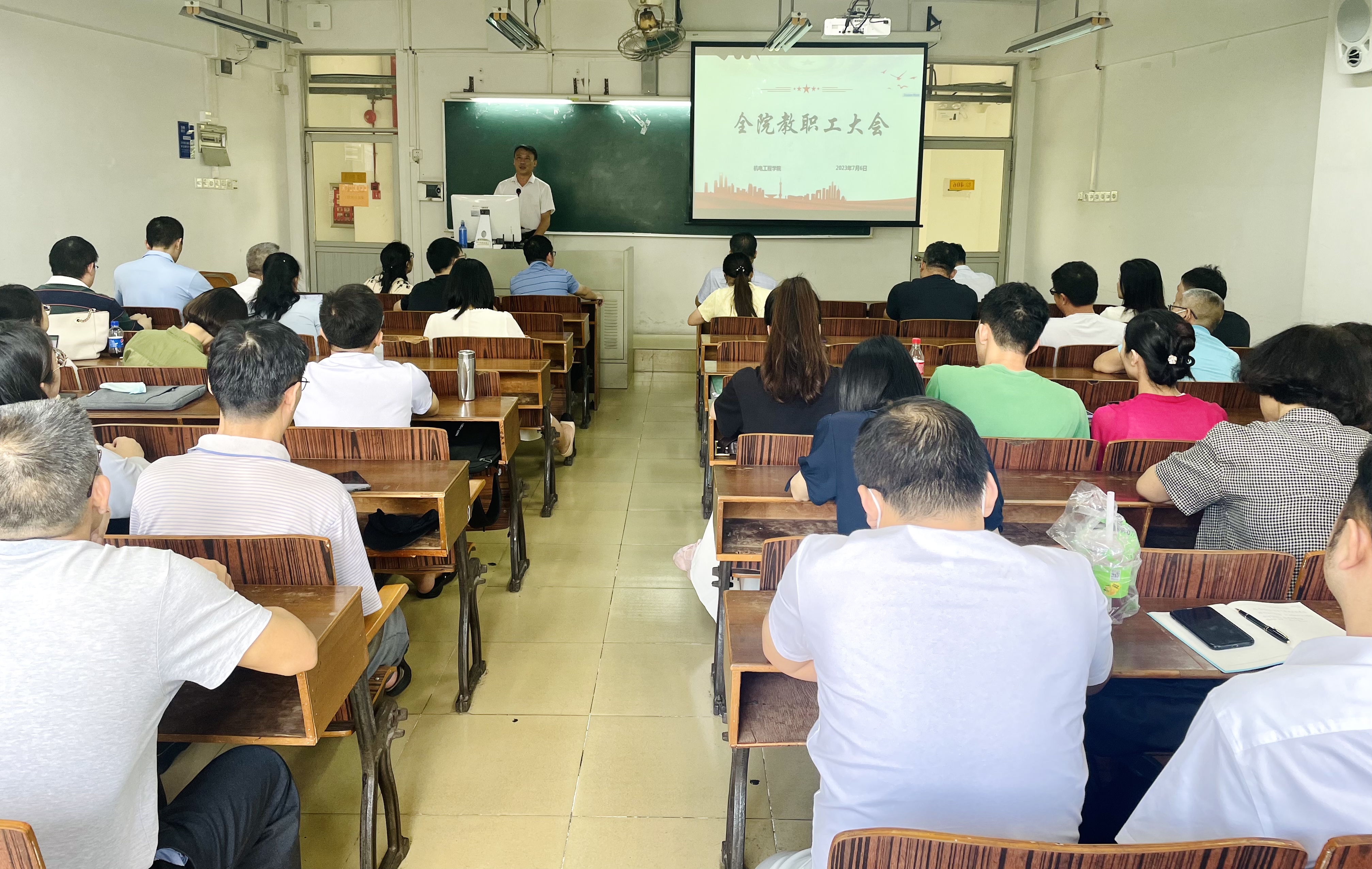 徐勇军结合学院近期取得的成绩和面临的挑战,对学院未来的发展方向做出了规划和展望。他指出全体教职工要明确学院发展定位,创新引领,产教融合,重视精品课程建设和实训室建设,扩大精品课程影响力和应用效果,切实推动学院专业内涵建设,不断提高人才培养质量。党总支书记邵超城对本次大会进行总结,对全体教职工提出3点希望:希望全体教职工利用暑假加强学习,提升自我;重视师德师风建设,提升教师育人水平;重视政治安全和意识形态安全,提高防诈骗意识,以高度责任心和强烈责任感主动履行时代赋予的责任。