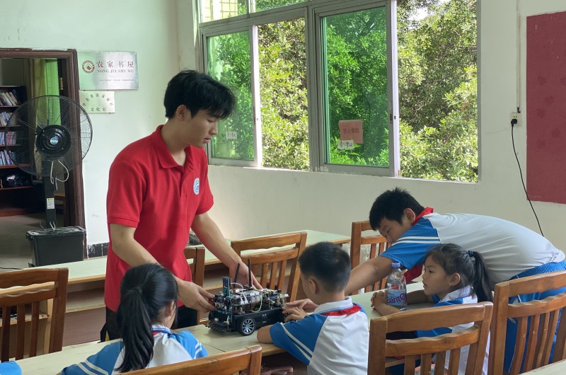 “梦想起航”三下乡社会实践服务队队员在为小朋友们讲解机械车
