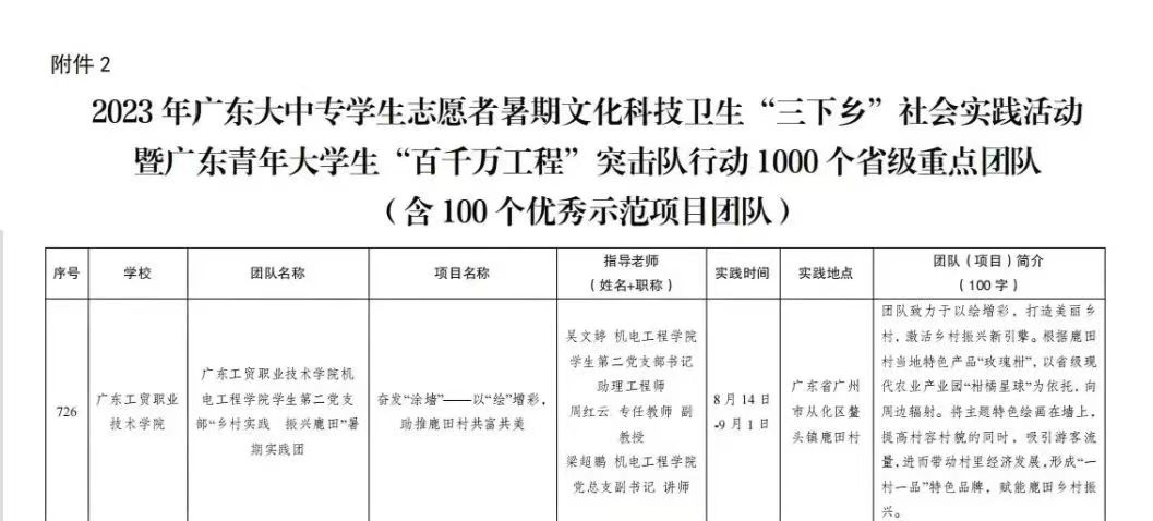 根据省学联《关于2023年广东大中专学生志愿者暑期文化科技卫生“三下乡”社会实践活动暨广东青年大学生“百千万工程”突击队行动全国、省级重点团队的公示》文件,williamhill威廉希尔官网机电工程学院学生第二党支部“乡村实践 振兴鹿田”暑期实践团奋发“涂墙”——以“绘”增彩,助推鹿田村共富共美项目荣获省级重点团队。