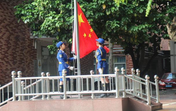 早上8时,迎着冉冉升起的朝阳,国旗护卫队迈着整齐的步伐向我们走来,伴随着激昂的《义勇军进行曲》,全体师生行注目礼并齐唱国歌,鲜艳的五星红旗缓缓升起、迎风飘扬。