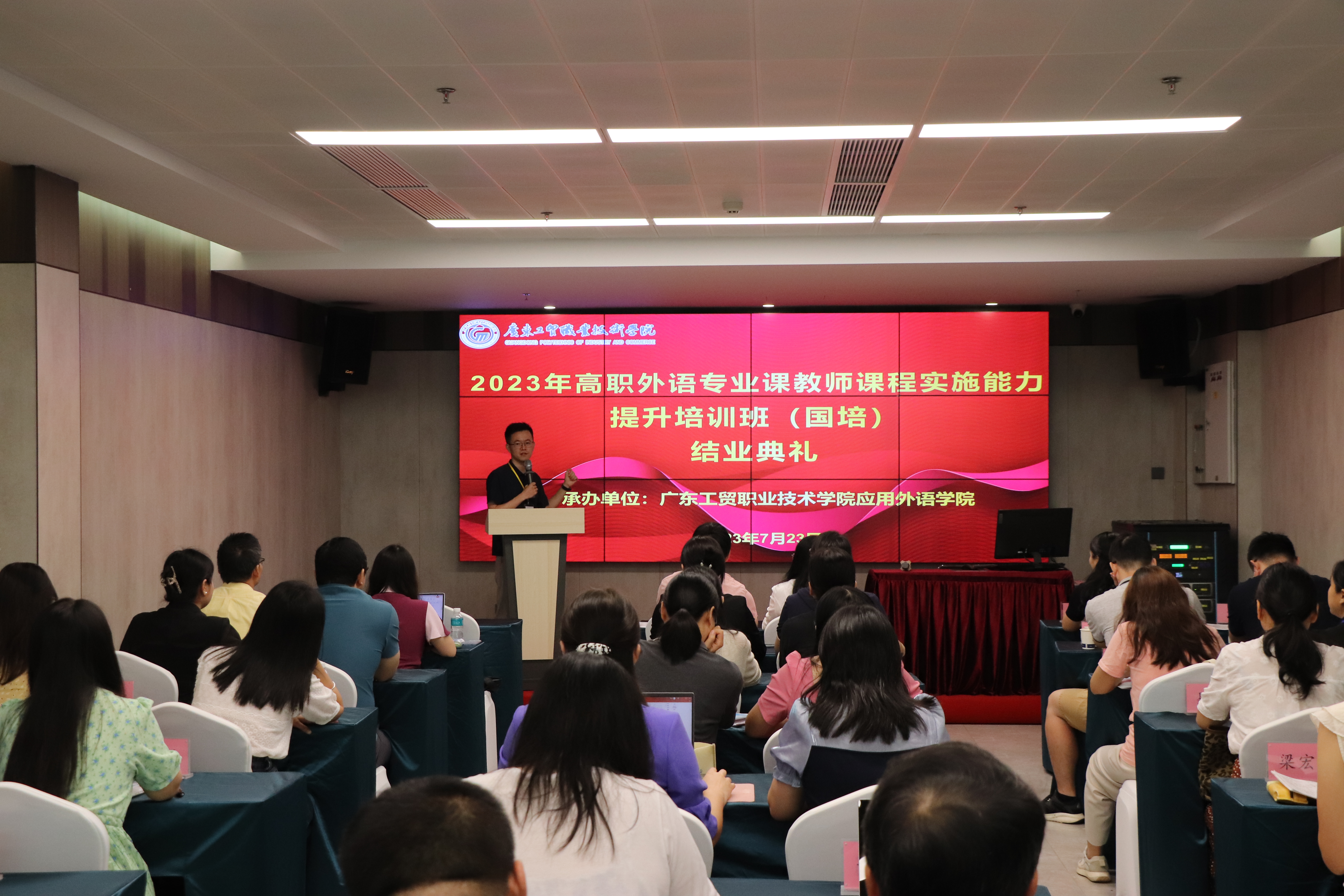 仲夏时节,万物俊秀。7月23日,williamhill威廉希尔官网高职外语专业课教师课程实施能力提升培训班(国培)顺利迎来了结业典礼。威廉希尔·williamhill(中国)中文官网应用外语学院彭枚芳院长、曾昭涛教授、项目负责人陆佳佳、骨干教师苏俊懿、班主任李迪、袁媛、学工办谭璇以及40位来自省内33所高职院校的学员参加了结业典礼。