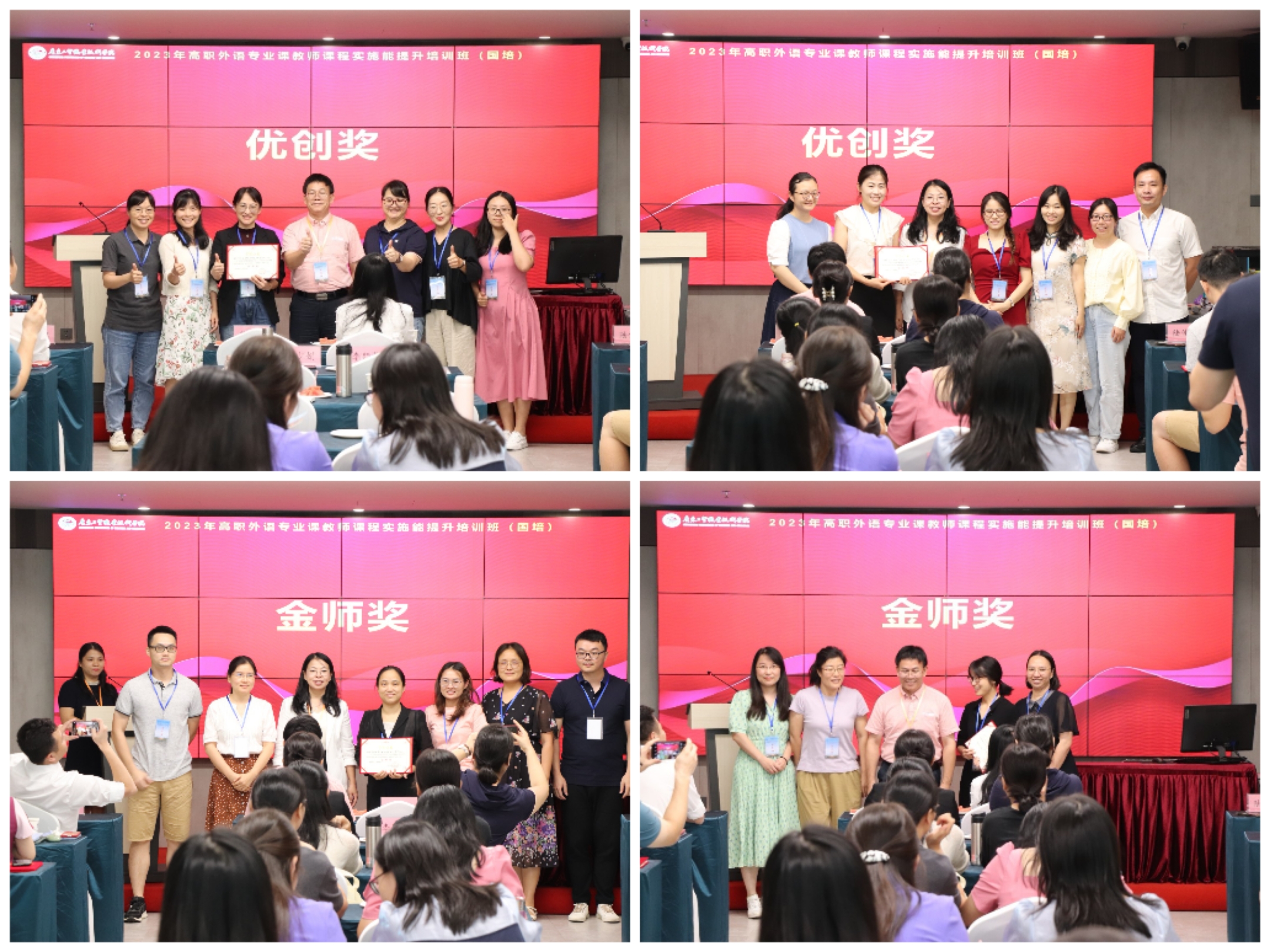 在浓浓温情暖意中,结业典礼迎来了最后的环节—颁奖典礼。负责人陆佳佳依次宣布了乐思奖、乐学奖、乐享奖、乐研奖的优秀个人获奖名单、及金师奖、优创奖优秀团队获奖名单。并有请彭枚芳、曾昭涛教授为大家颁发证书。学员们带着学习干货与荣誉笑眼盈盈、满载而归。“国培计划(2023)”—高职外语专业课教师课程实施能力提升项目至此圆满落幕。