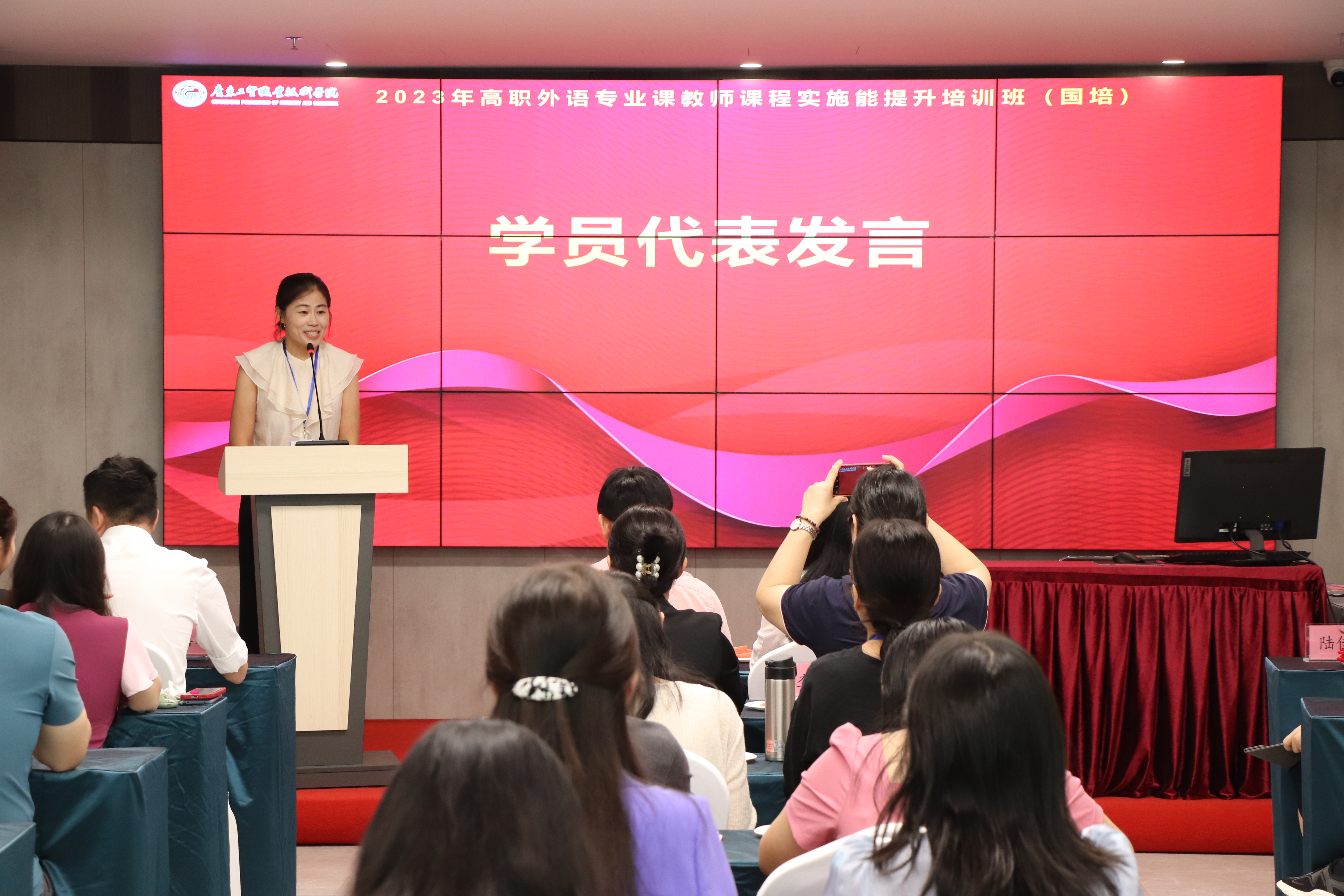 珠海艺术职业学院教师梁宏利、广东轻工职业技术学院李少娟作为学员代表发言。梁宏利、李少娟真切表达了对国家、对工贸、对项目培训团队以及对参训伙伴们的感谢,精彩发言博得掌声阵阵,真情流露感染全场与会人员。