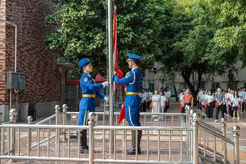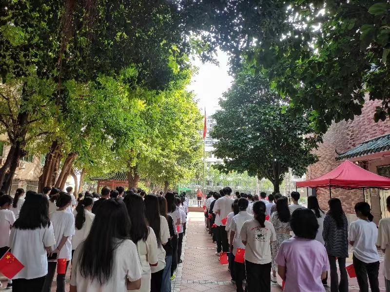 上午8时30分,升国旗仪式正式开始,国歌响起,全场师生向国旗致注目礼,高声齐唱《义勇军进行曲》。五星红旗冉冉升起,在阳光中迎风飘扬,全体师生面向国旗,表达对伟大祖国的深切祝福和崇高敬意。