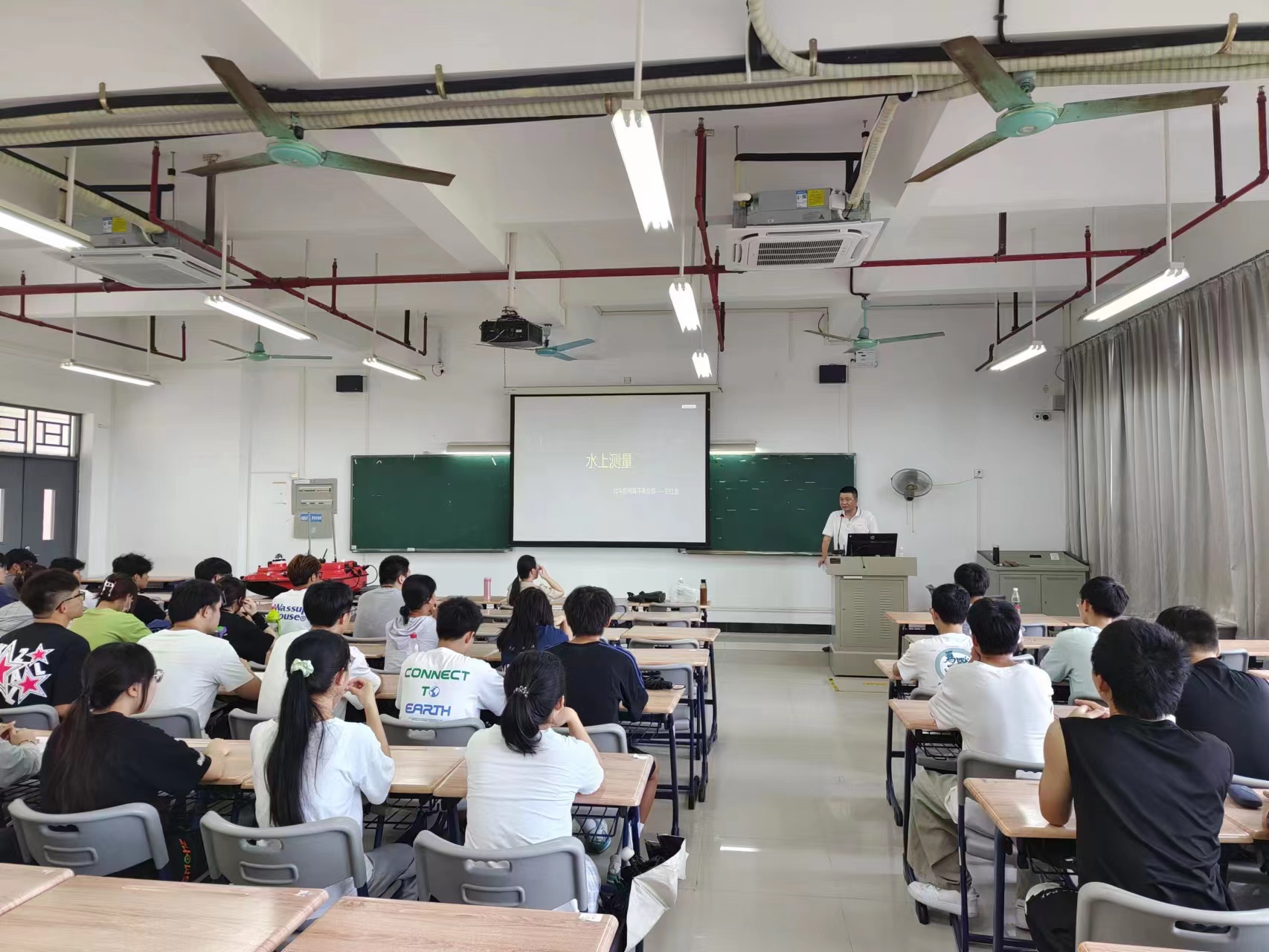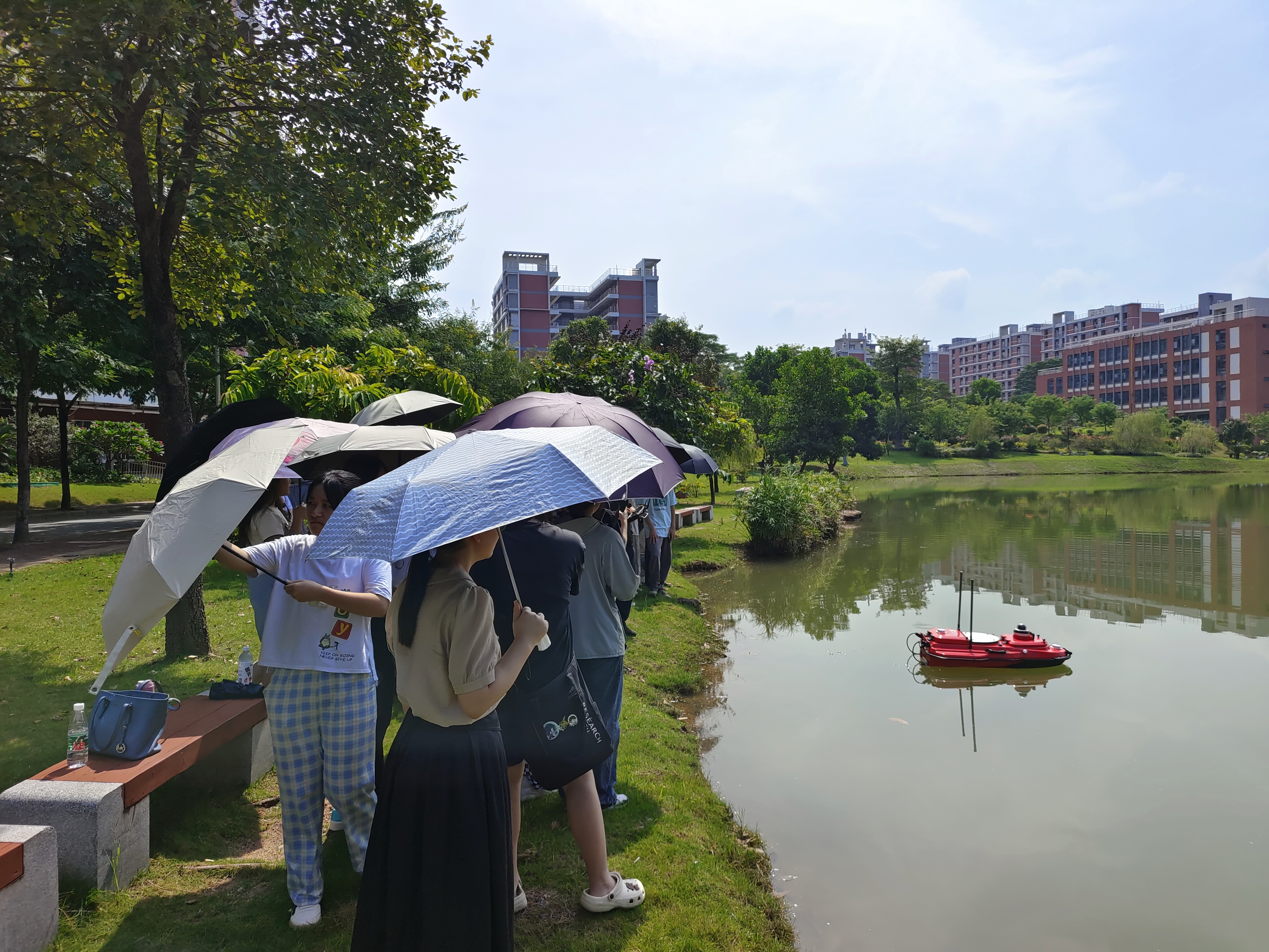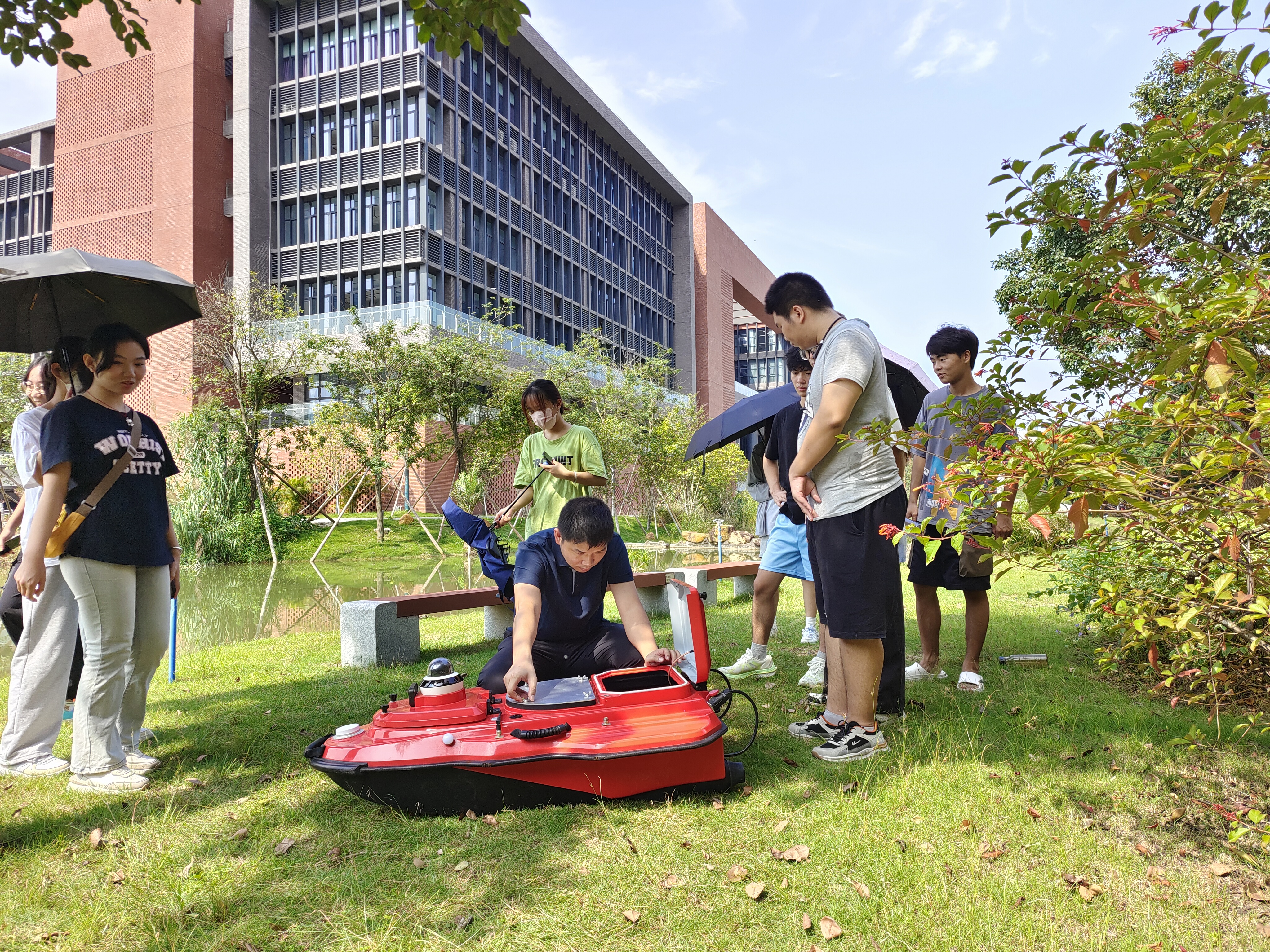 南方测绘史红金经理在课堂上面向学生详细讲解了水深测量基本要点,最新智能无人船水深测量系统的产品性能与操作方法及其具体的工程实践案例等。随后,师生与工程师们一起,在白云校区图书馆后面的湖面进行了实地演练。通过这一实操演练,有力地推动了学生理论与实践深度结合、岗课对接,并为教师进一步构建适应高职学生更愿意动手的教学模式提供了宝贵的实践经验,受到学生的普遍欢迎且取得了良好的教学效果。