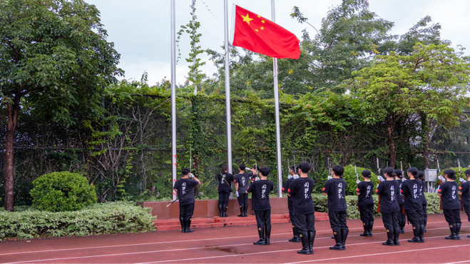 升旗仪式准时开始,国旗仪仗队的队员们脚步铿锵,庄严护送国旗入场,伴随着《中华人民共和国国歌》的响起,五星红旗冉冉升起,全体师生肃立,整齐列队,向国旗行注目礼、齐唱国歌。