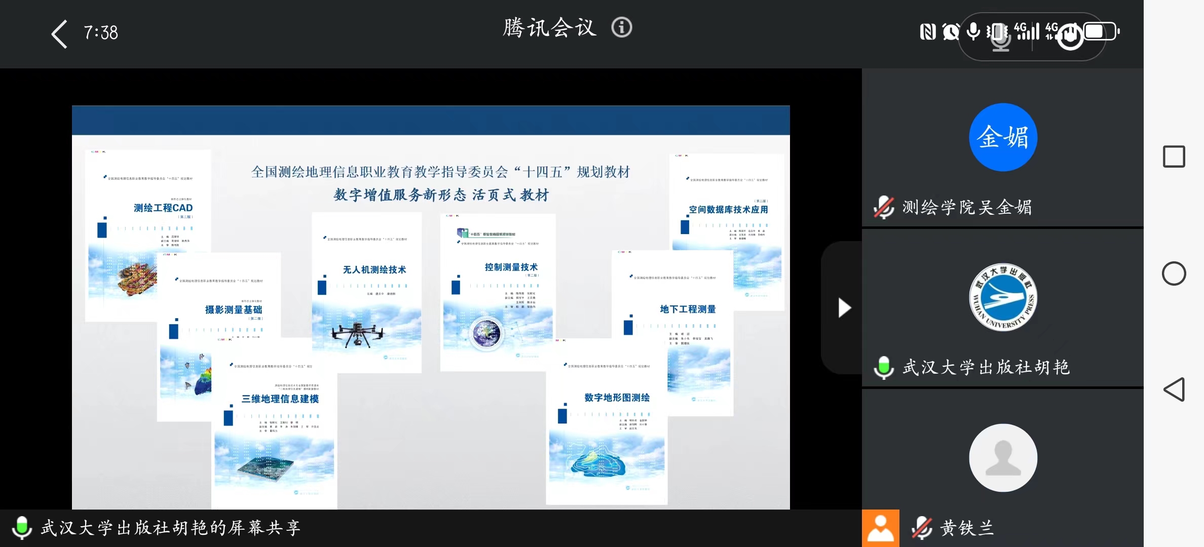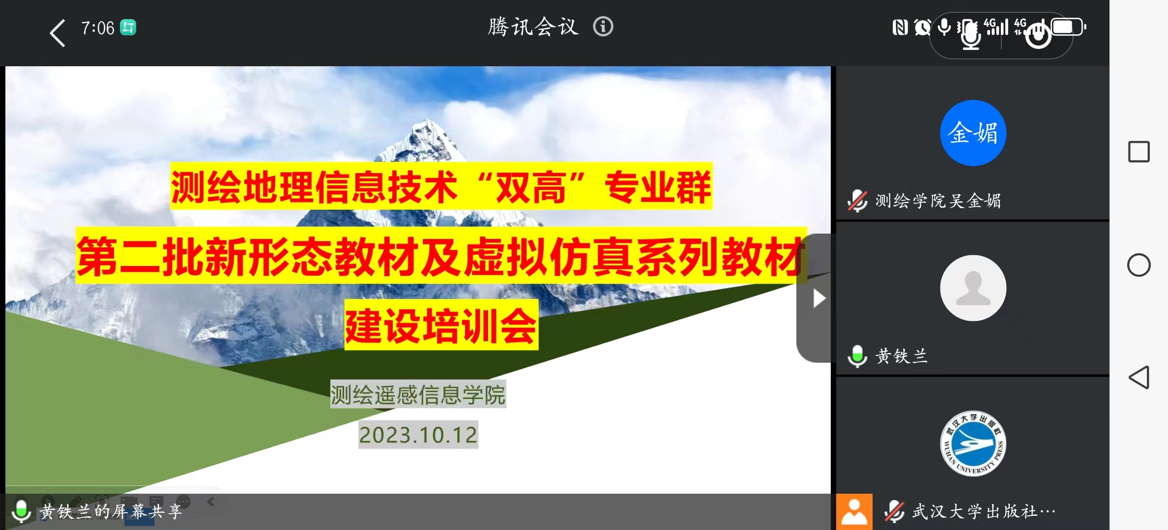 2023年10月12日晚上,测绘遥感信息学院召开测绘地理信息计划国家“双高”专业群第二批新形态教材及虚拟仿真系列教材建设项目线上培训研讨会。本次会议由武汉大学出版社理工分社社长胡艳进行培训,测绘学院地理信息系主任黄铁兰主持,测绘学院副院长高照忠、各教材编写团队负责人及成员共30余人参加。