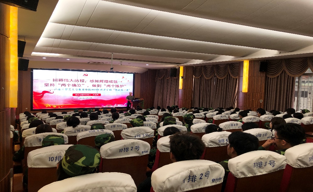 本次思政课的主题是:回顾伟大历程,感知辉煌成就,坚持“两个确立”,做到“两个维护”。首先,叶宜同简要回顾了中国共产党创立的背景及伟大的发展历程;接着通过图片和视频的形式向同学们展示中国人民在中国共产党的坚强领导下,尤其是党的十八大以来,在军事国防、经济建设、社会建设、教育体育等领域取得的辉煌成就;最后他与同学们共同学习了什么是“两个确立”、“两个维护”,并向大家提出,作为新时代的大学生,要深入学习宣传习近平新时代中国特色社会主义思想,深刻领悟“两个确立”的决定性意义,把“两个确立”转化为做到“两个维护”的高度自觉,增强“四个意识”、坚定“四个自信”、做到“两个维护”,不断增进对党的创新理论的政治认同、思想认同、理论认同、情感认同,铸牢永远听党话、跟党走的思想根基。