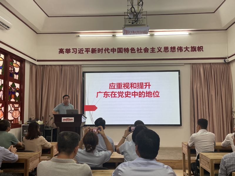 随后,学院教师党员认真聆听了广州农讲所纪念馆举办的“新时代文明实践站·红色文化讲堂”专题党课,主讲人为南方医科大学原人文与管理学院院长、广东叶剑英研究会常务副会长兼法定代表人、广州市中共党史学会副会长、中共党史人物研究会副会长林雄辉,党课专题为《应重视和提升广州在中共党史的地位》。他从广东共产党早期组织、毛泽东在广州的理论及实践、以及广州起义等三件事切入,旁征博引,充分论述了广东在共产党创建史和发展史上的重要历史地位。