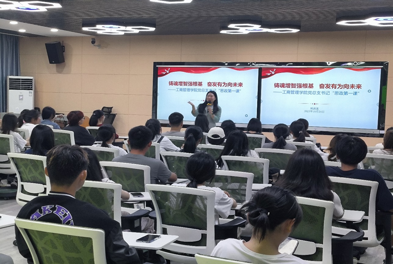 为深入学习贯彻习近平新时代中国特色社会主义思想,教育引导学生立足新时代、新征程,努力成长为堪当民族复兴重任的时代新人。2023年10月24日晚,工商管理学院党总支书记周清莲在白云校区知行楼604课室为来自学院各专业60余新生讲授“思政第一课”。