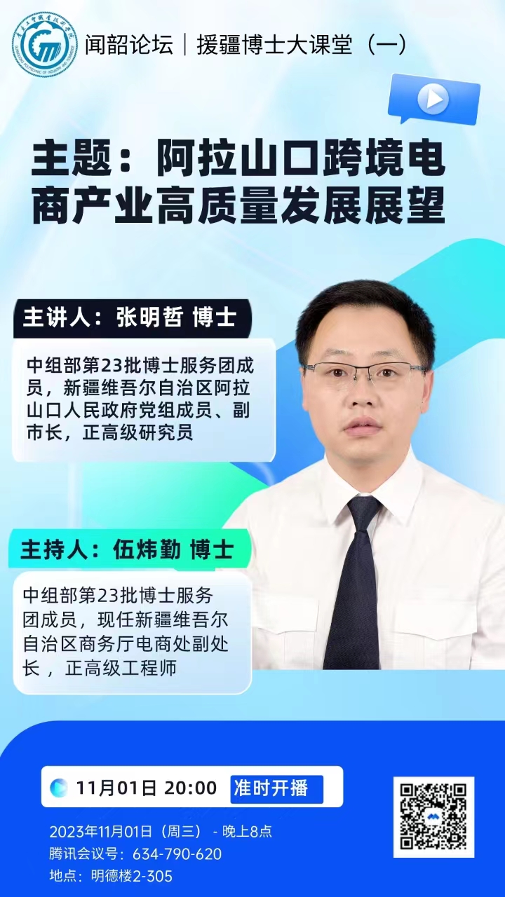 为进一步贯彻党的二十大精神,落实学校党委决策部署和学校高质量发展的要求,经济贸易学院于2023年11月1日,在明德楼2-305召开了“跨境电商专业高质量发展研讨会”并举办了“闻韶讲堂之援疆博士大课堂主题讲座”。