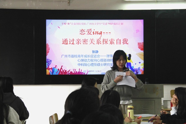 为了进一步提高大学生的心理素质,促进大学生的身心健康和谐,11月14日下午,在荔湾校区面向艺术与教育学院30名女大学生开展了“恋爱ing---通过亲密关系探索自我”主题的心理健康团体辅导活动。此次活动由学生处心理咨询中心承办,邀请了荔枝青年成长促进会理事、副秘书长张静老师主讲。