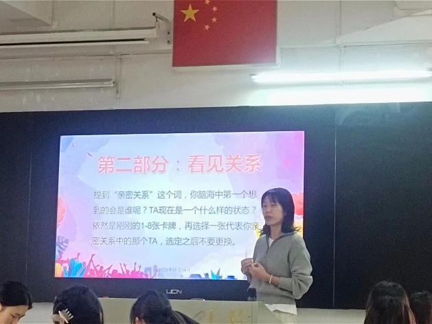 张静老师从三个部分进行活动的展开。第一部分中,张静老师从认识自己开始讲解。张静老师提到“亲密关系是众多关系中的一种,在关系的一头是你自己,那么你了解你自己吗?”在此部分,张静老师从8张OH卡牌的选择引导大家去了解自己的当前状态。张静老师通过提出问题,引导讨论,请同学进行分享等形式让大家了解到自己目前的情绪状态。