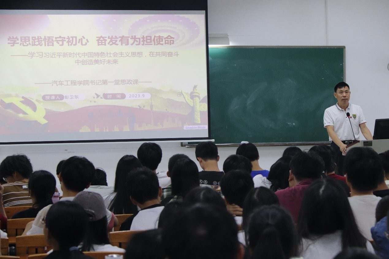 为全面学习习近平新时代中国特色社会主义思想,将党的创新理论滋养初心、引领使命,把初心和使命变成锐意进取、开拓创新的精气神和努力学习的原动力。2023年11月8日上午在明德楼2区303,汽车工程学院党总支书记彭卫东以“学思践悟守初心,奋发有为担使命”为主题,为2023级电子信息工程技术1、3、4班共165名新生上了第一堂思政课。