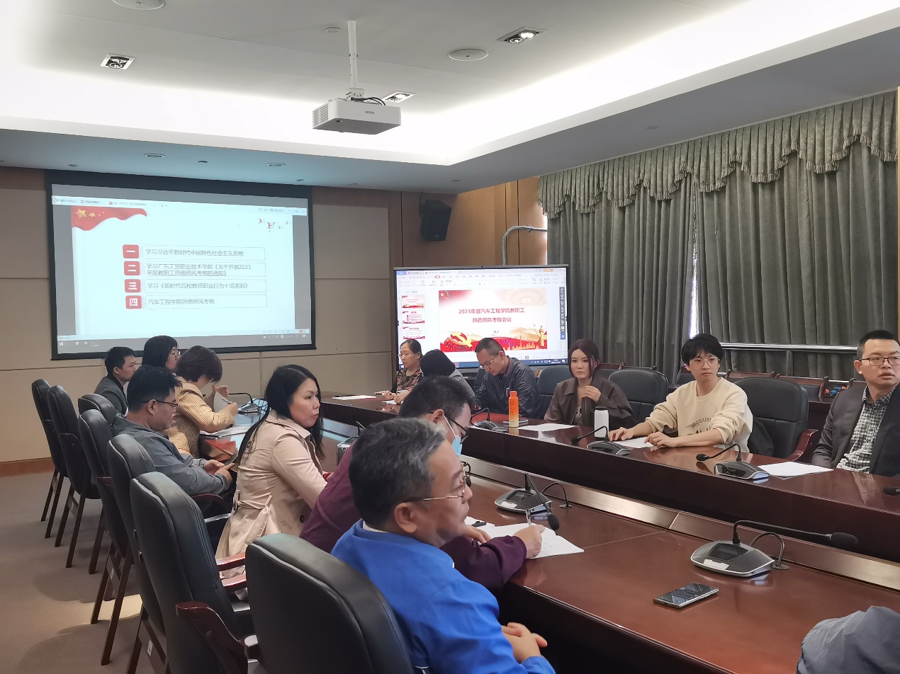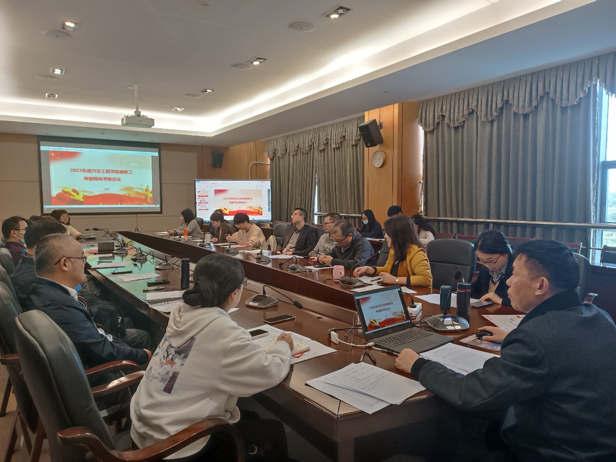 最后,彭卫东书记开展了汽车工程学院师德师风的考核工作,首先介绍了师德考核的范围包括全体在职在岗教职工,考核由个人自评、他人评价和部门评定三个部分组成,考核结果分为优秀、合格、基本合格和不合格四个等次。其次,彭卫东组织全体教职工完成了师德个人自评,通过投票的方式确立了师德考核小组代表。最后,全体教职工通过匿名打分的方式完成了他人评价部分,并签订了师德师风承诺书。