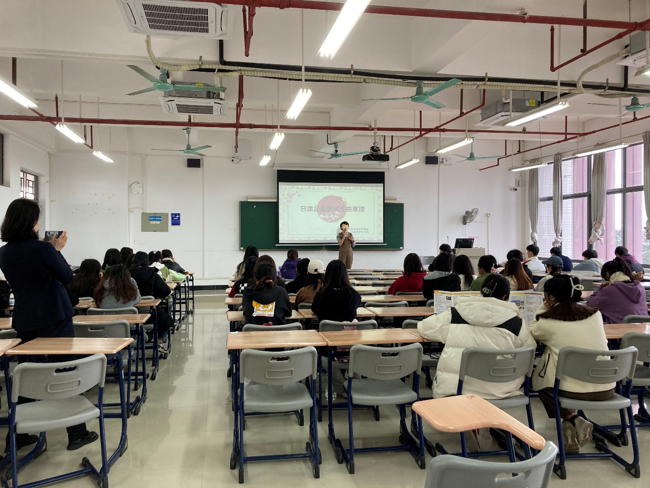 为促进和加强商务日语专业的就业工作,推动商务日语专业24届毕业生的就业工作顺利进行,使即将面临毕业的大三学生认识社会、了解企业,帮助同学们为下学期的毕业定岗实习和找工作就业做好各方面准备,商务日语专业带头人雷莹老师邀请新干线教育集团日本就业部李佳总经理于11月16日下午为商务日语专业24届毕业生进行了就业指导讲座。