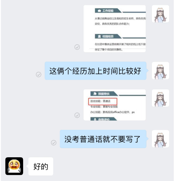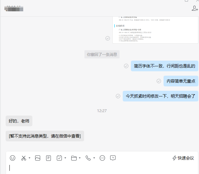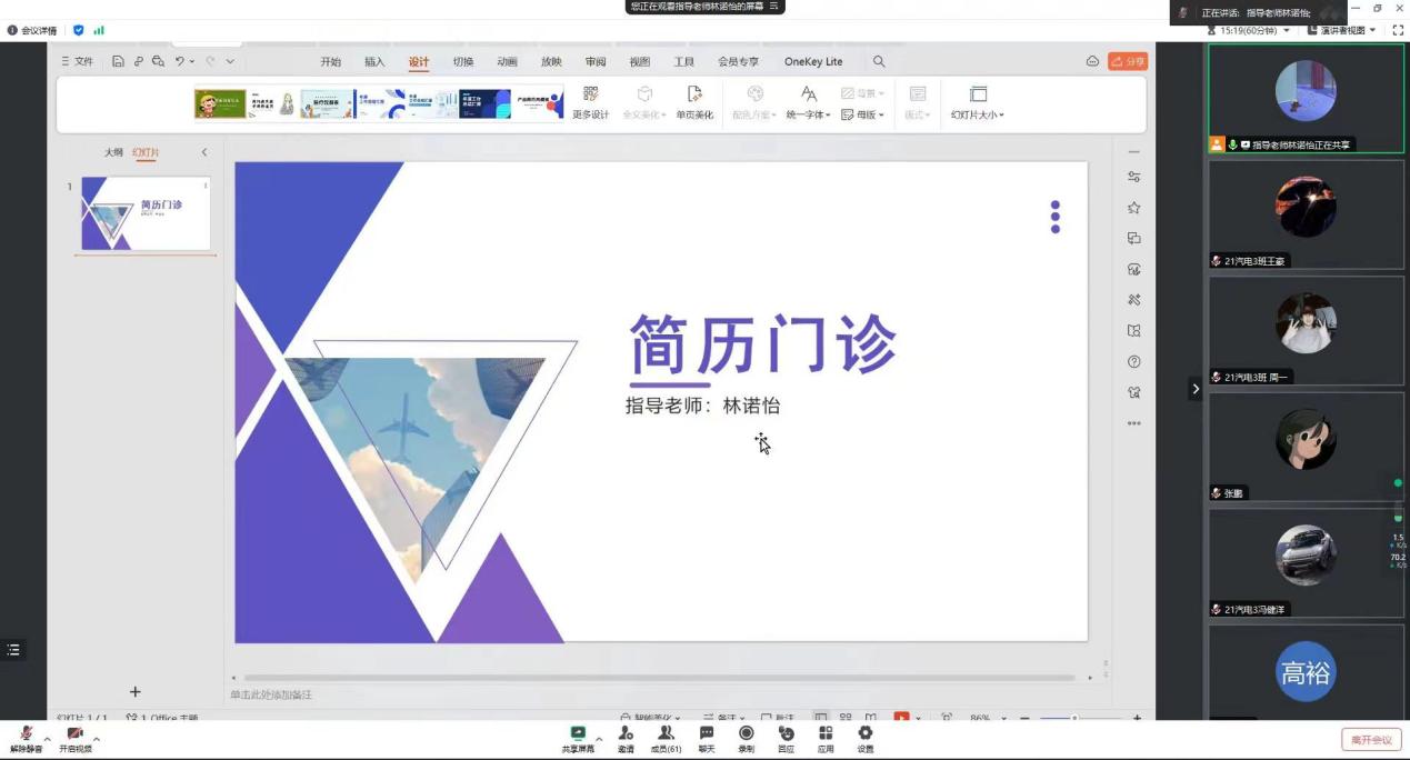 各位辅导员采取多种方式为学生提供简历修改指导,如现场一对一指导、线上“简历门诊”会议、简历修改班会等。在简历指导过程中,辅导员老师们耐心、细心,精准解决每一位学生职业定位、简历制作、求职面试过程中遇到的问题,学生专心、称心,认真听指导、积极互动反馈,师生合力解决学生们的求职难题。