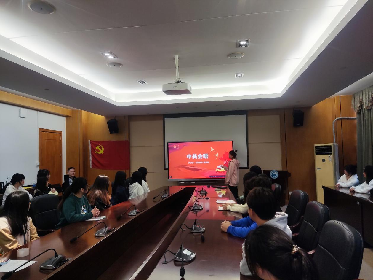 最后,陈梦童同志向大家介绍了中美会晤的背景、影响、内容和展望,强调要以客观、理性的态度看待中美关系的发展,通过对话协商解决分歧和问题,推动中美关系走向更加稳定、互利共赢的方向。此次会晤积极、全面、富有建设性,为实现中美关系的健康、稳定、可持续发展指明了方向。我国应该秉持着平等、互利、共赢的原则,共同应对全球性挑战和问题,为世界和平与发展作出更大的贡献。