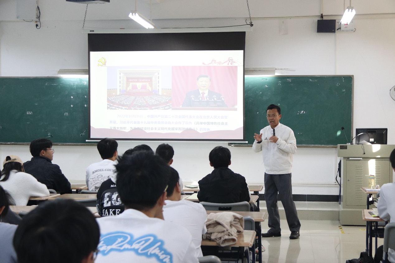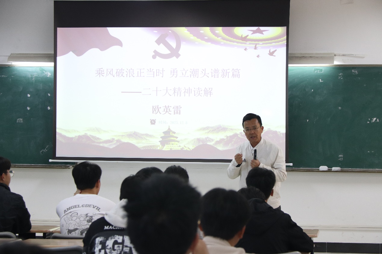 为深入学习宣传贯彻党的二十大精神,深刻领会中国式现代化的中国特色和本质,汽车工程学院于2023年12月8日下午在明德楼2区403教室为2023级新能源4班、电信4班的113同学讲授党的二十大精神——“乘风破浪正当时,勇立潮头谱新篇”。汽车工程学院退休教授欧英雷主讲,学院党总支书记彭卫东主持。