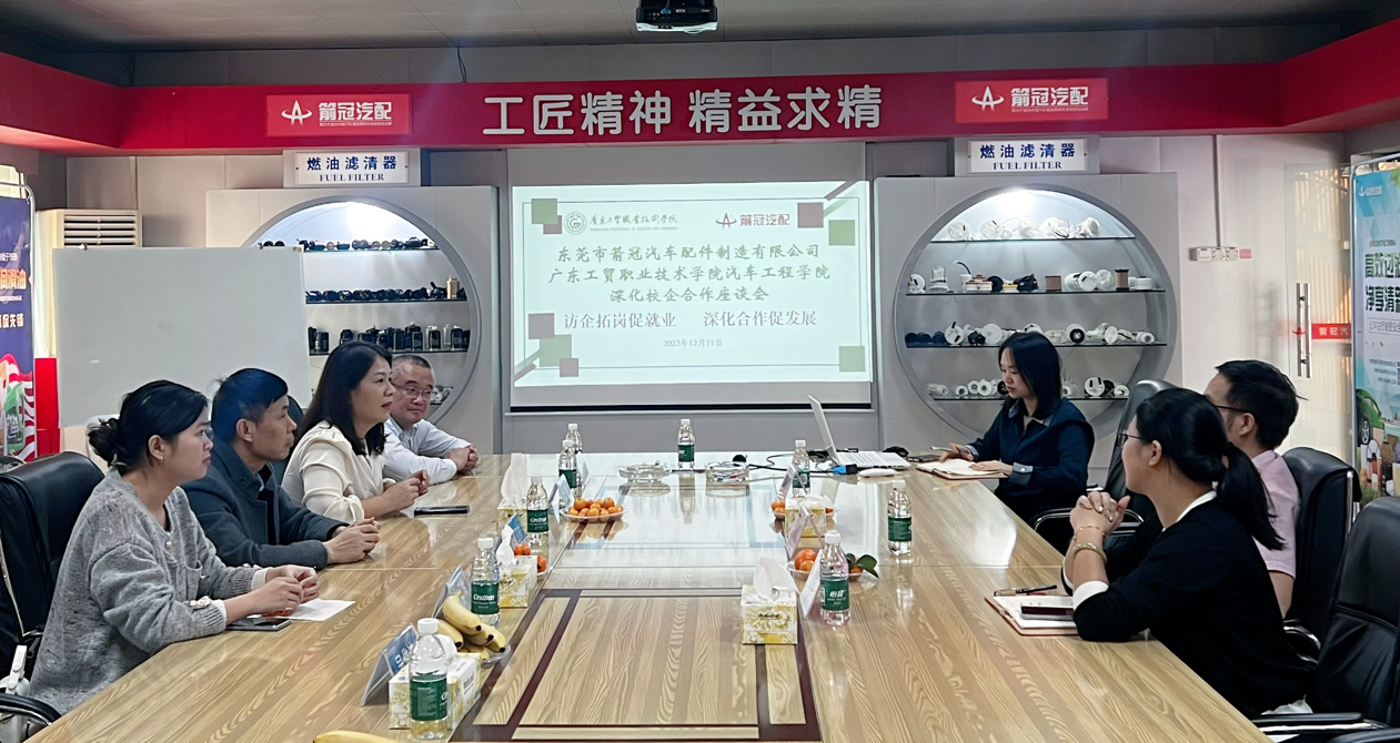 为响应教育部办公厅关于开展高校毕业生促就业攻坚行动的号召,进一步了解学生实习情况、拓宽应届生就业渠道、提高学生就业质量,同时深化校企合作、推动协同育人成果转化、着力提升学生的社会实践能力和岗位适应能力,12月11日上午,汽车工程学院党总支书记彭卫东、党总支副书记欧敏、校企合作专员陈宏伟、2024届就业专员林诺怡、吴俊迪一行前往东莞市箭冠汽车配件制造有限公司(以下简称箭冠汽配集团)走访座谈,调研企业对技术型人才需求。