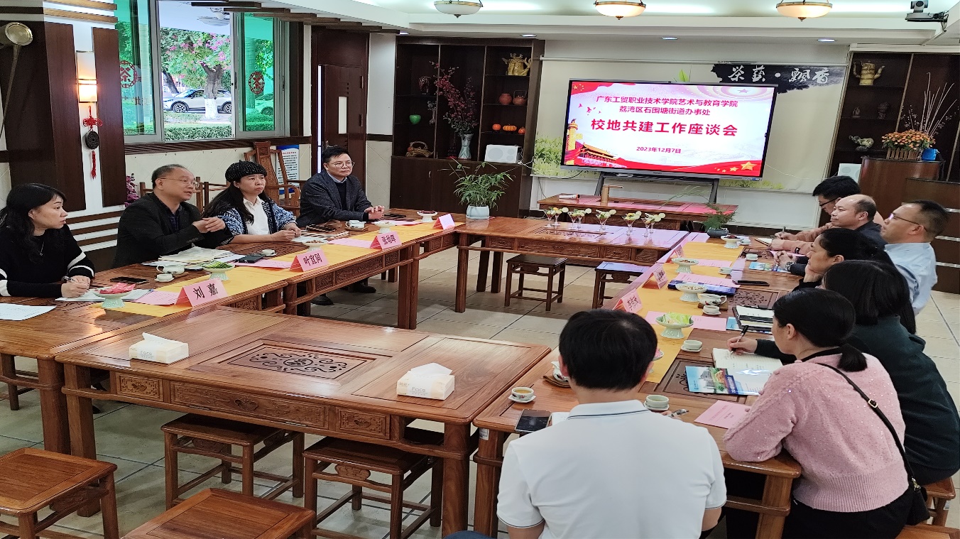12月7日下午,石围塘街道党工委书记黄健明、办事处副主任李伟珍、武装部部长朱继志等一行人来到艺教学院走访交流,参观校园,参加校地共建座谈会。会议由学院临时负责人张幼晖主持,学院党总支临时负责人叶宜同、院办主任刘嘉和学校保卫处杨文明老师参加了座谈会。