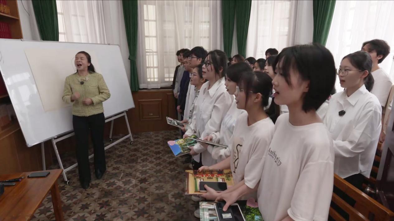 在课堂上,学生充分发挥自身专业知识和特长,以影像、手绘插画、动画片制作、舞台剧等形式,抒发自己对红色文化的青春感悟,张幼晖鼓励学生发挥专业优势,把红色文化传承下来,传播出去。课堂的最后,师生共同咏唱《国际歌》,为这堂思政课划上了完美的句号。