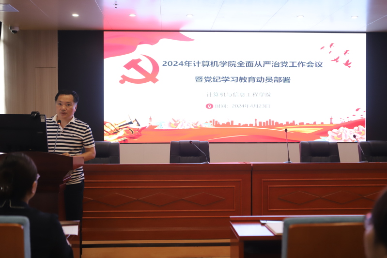 随后,学院党总支书记张宁会上作了计算机学院2024年全面从严治党工作暨党纪学习教育动员部署讲话。张宁首先传达了上级有关文件和会议精神,包括省委教育工委、省教育厅2024年全省教育系统全面从严治党工作视频会议,以及学校2024年全面从严治党工作会议暨党纪学习教育动员部署会议的主要内容。其次,张宁代表计算机学院党总支,对计算机学院党纪学习教育相关工作进行了部署,明确自2024年4月至7月开展党纪学习教育,结合学校要求,紧扣主题教育总要求,主要从三个方面开展工作,第一是要提高政治站位,深刻理解开展党纪学习教育的重大意义;第二是要坚持学深悟透,准确掌握《中国共产党纪律处分条例》的主旨要义和规定要求;第三是要做到统筹兼顾,一体推进党纪学习教育出实招、务实功、见实效。