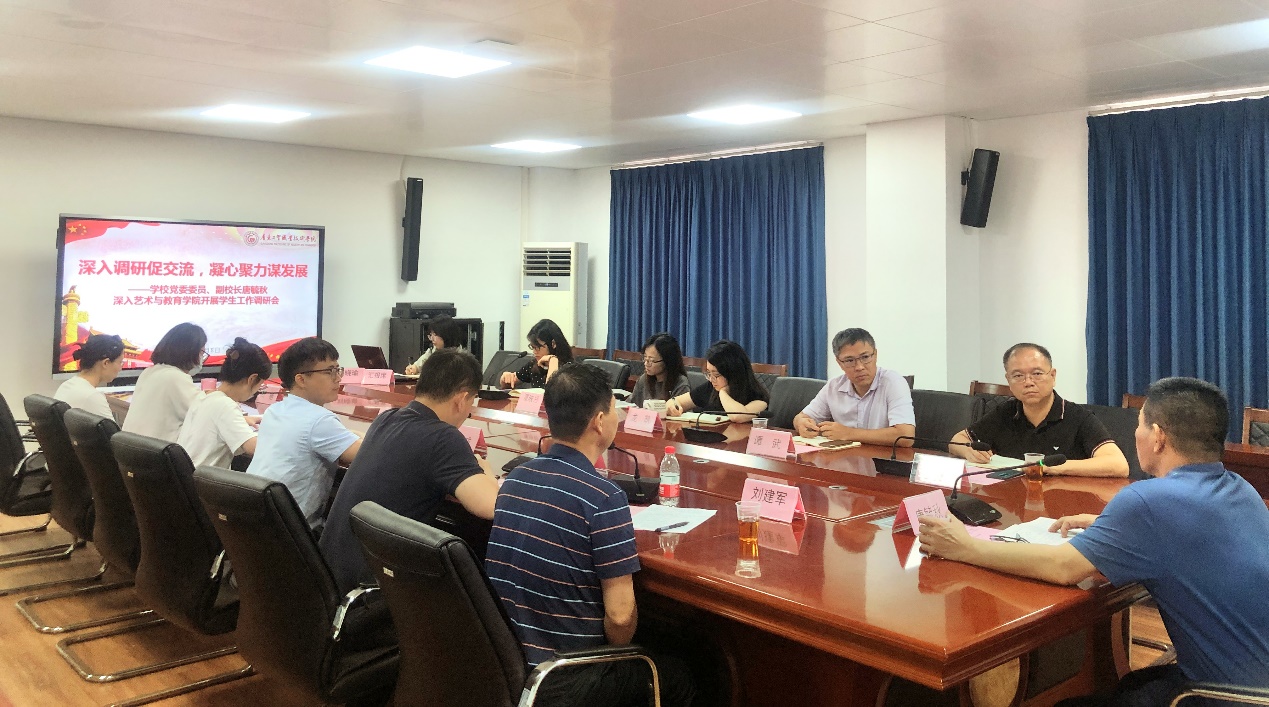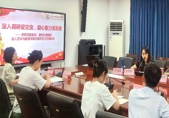 为进一步落实立德树人根本任务,加强威廉希尔官网辅导员队伍建设,推动学生工作实现高质量发展,5月8日下午,学校党委委员、副校长唐毓秋以及学生工作处处长刘建军、校办副主任苏文杰一行深入艺术与教育学院,开展了面对学生工作的专题调研座谈会,会议由学院党总支临时负责人、副书记叶宜同主持,全体辅导员参加了会议。