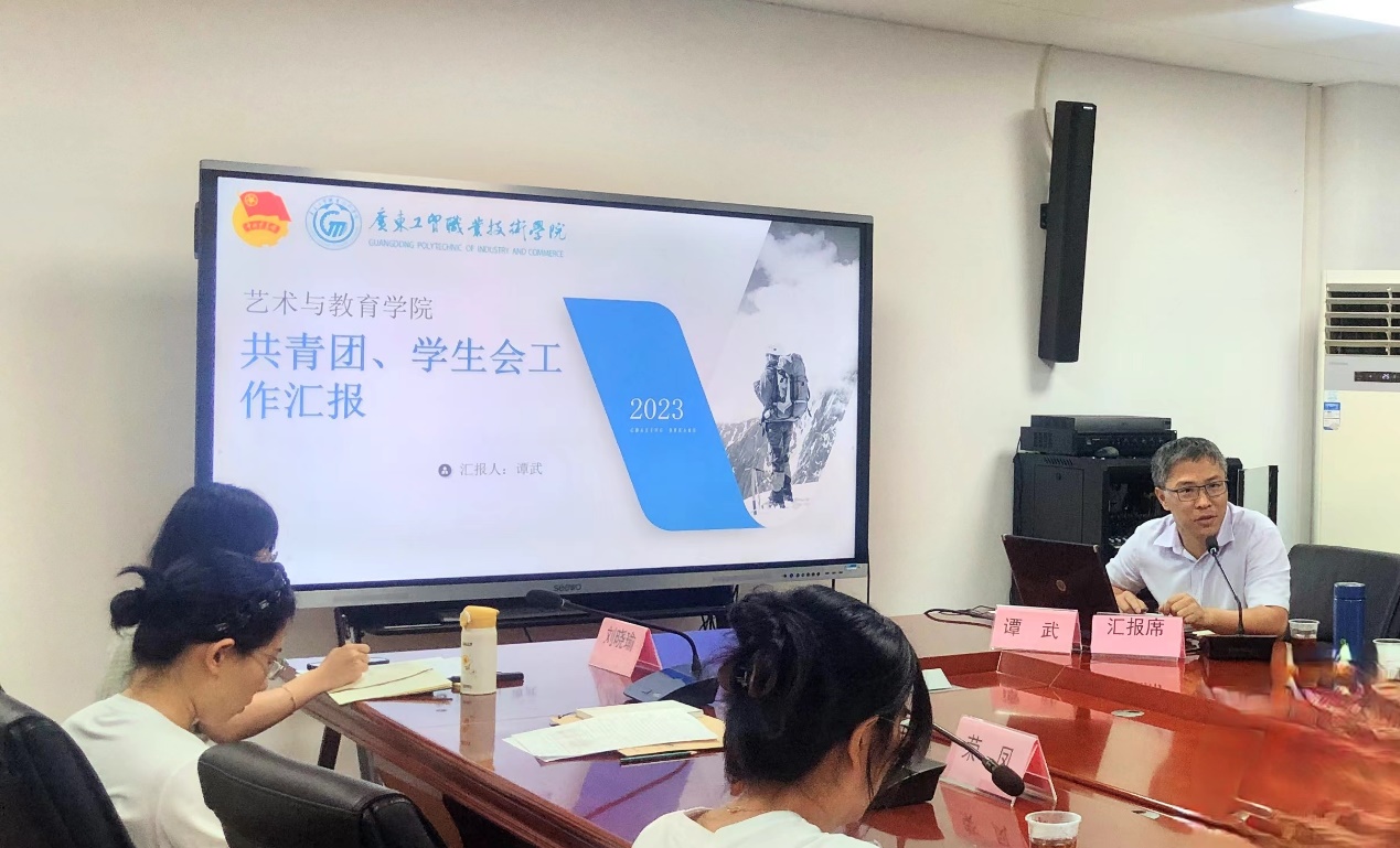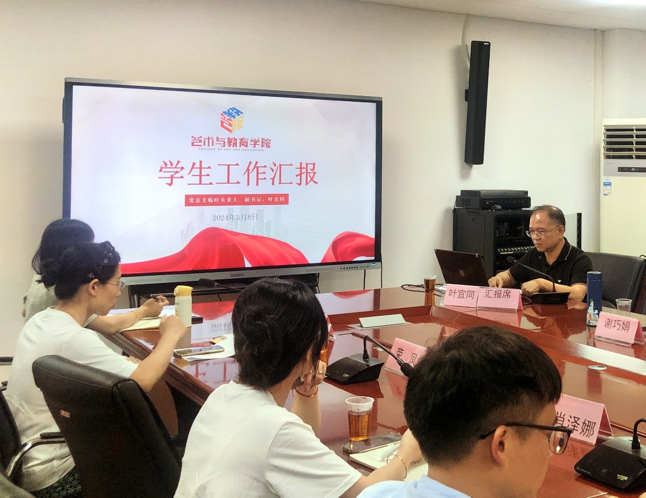 学工办主任谭武就学院共青团和学生会工作进行了总结性汇报,他概括了2023年工作开展情况及成果,分别从思想政治引领主责主业、实践育人体系以及团学改革向纵深发展三个方面总结了工作情况,并深入了分析了存在的问题和不足之处。叶宜同则介绍了艺教学院辅导员队伍的建设情况,提出了其中存在的问题及解决思路。随后,他对2024年开学至今的学生工作做了总结汇报,详细介绍了就业征兵、“一站式”社区建设、资助育人、学生心理健康、少数民族学生帮扶、社会实践育人等方面的工作,并提出了下一步工作的思路。