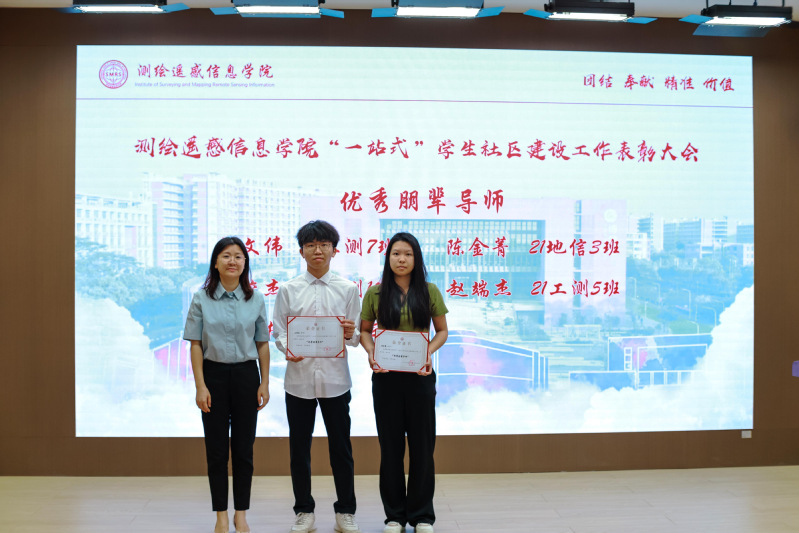 接着,高照忠宣读了《测绘遥感信息学院关于表彰2023-2024学年第一学期“一站式”学生社区“优秀学业导师”等荣誉的决定》,高照忠、李元、罗小霞分别为获得“优秀学业导师”“优秀朋辈导师”“先进个人”“优秀志愿者”“学习标兵”荣誉的老师和同学们颁奖。