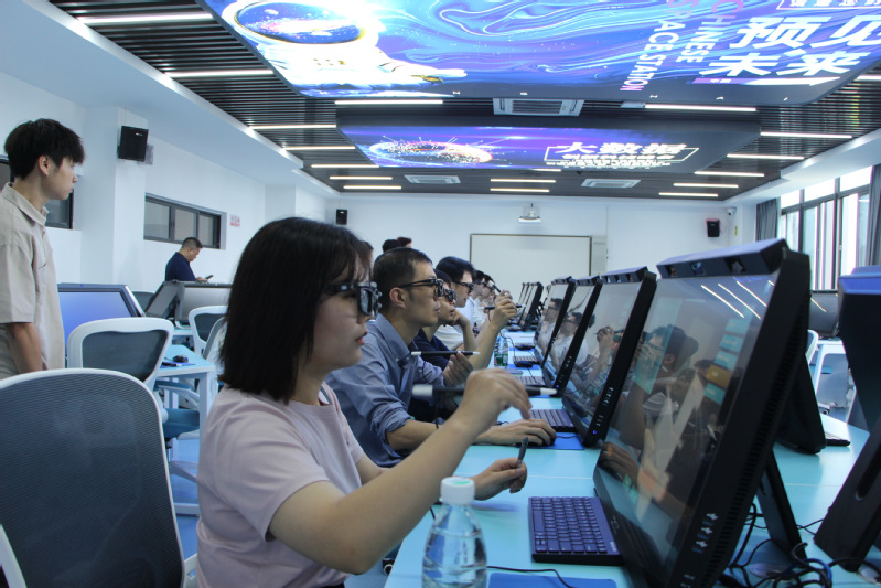 首先,由副院长高照忠带领来访嘉宾参观测绘地理信息技术校企协同就业创业创新示范实践基地、工信部中小企业发展促进中心党建与创新文化长廊、测绘地理信息虚拟仿真实训基地、地形地貌与无人机航测模拟实训室、无人机应用与创新空间、测绘技术虚拟仿真体验中心等特色场所,并邀请嘉宾体验Z-space桌面全息交互一体机、VR座舱设备、MR眼睛等设备。参观过程中,就专业建设情况、人才培养方案、课程模块设置、人才引进培养、产教融合实践、技术创新应用、成果激励转化等方面展开下深入讨论。