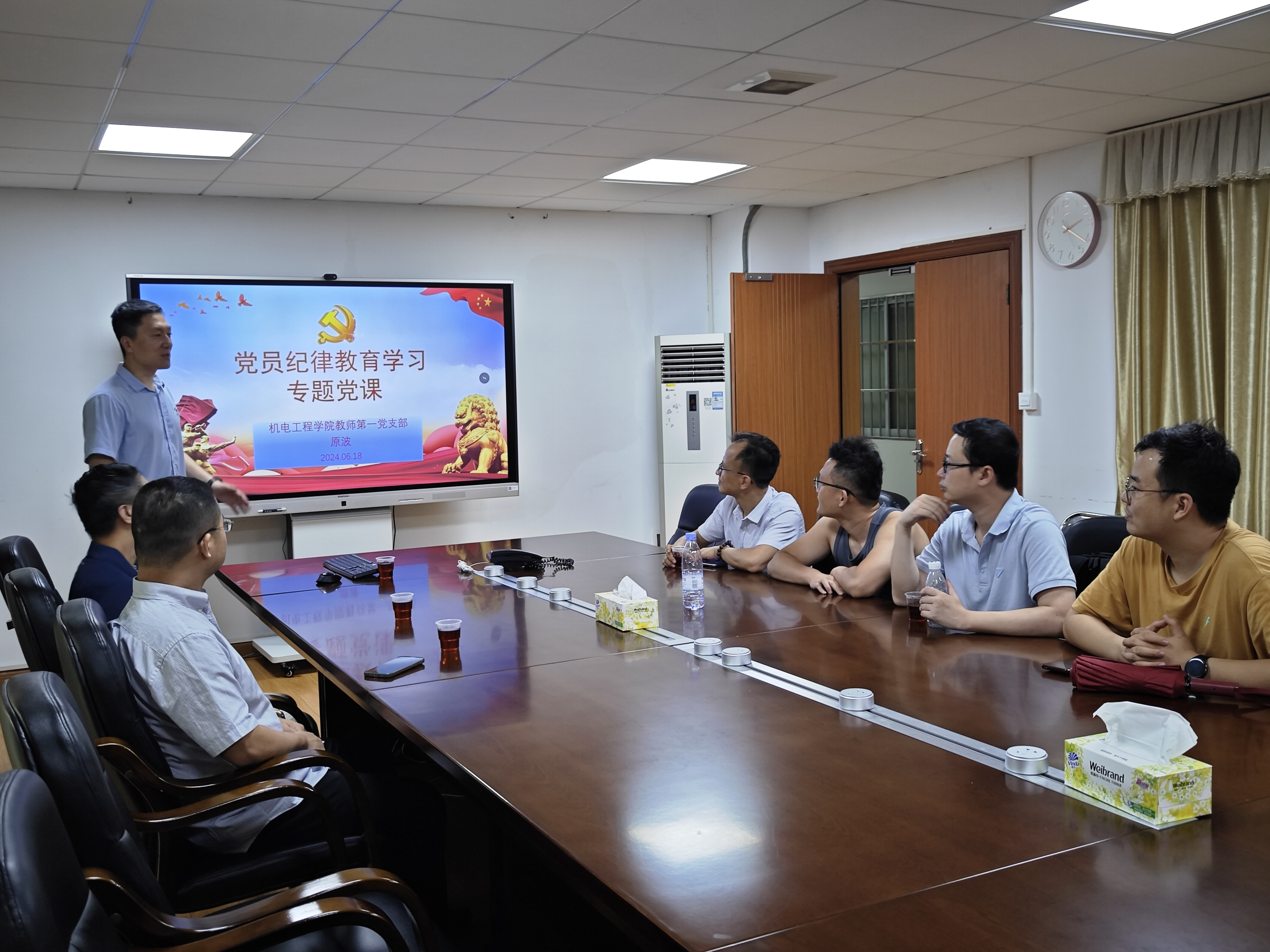 为深入贯彻落实全面从严治党要求,推动党纪学习教育走深走实,强化党员干部党性修养和纪律意识,6月18日下午2点,机电工程学院教师第一党支部在天河校区第一会议室开展党纪学习教育专题活动,教师第一党支部全体党员参加会议,会议由教师第一党支部书记原波主持。
