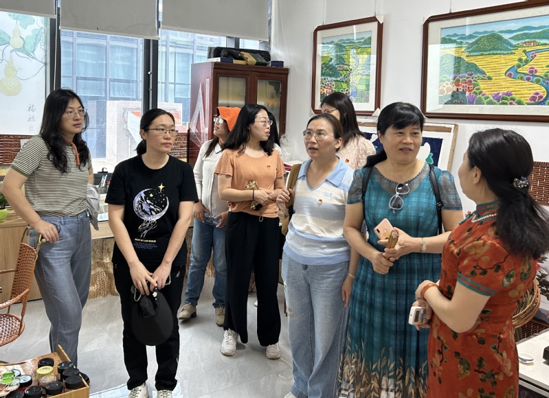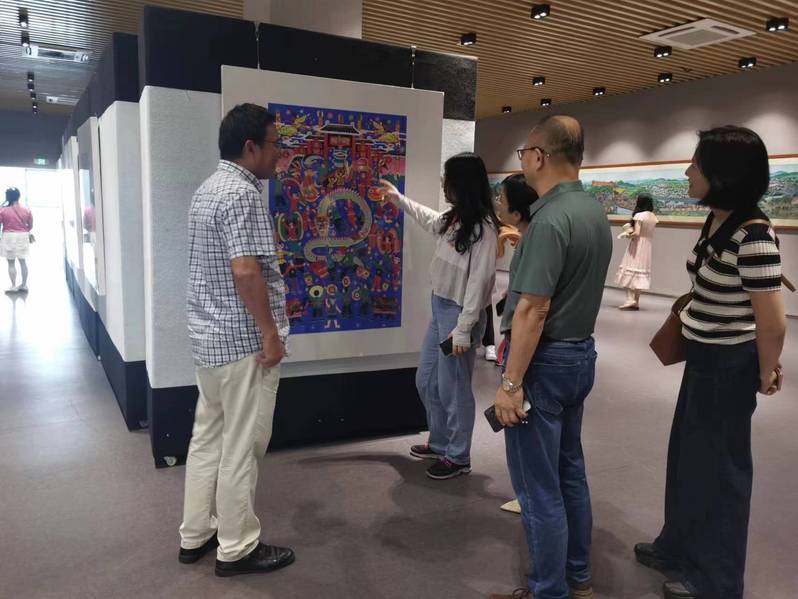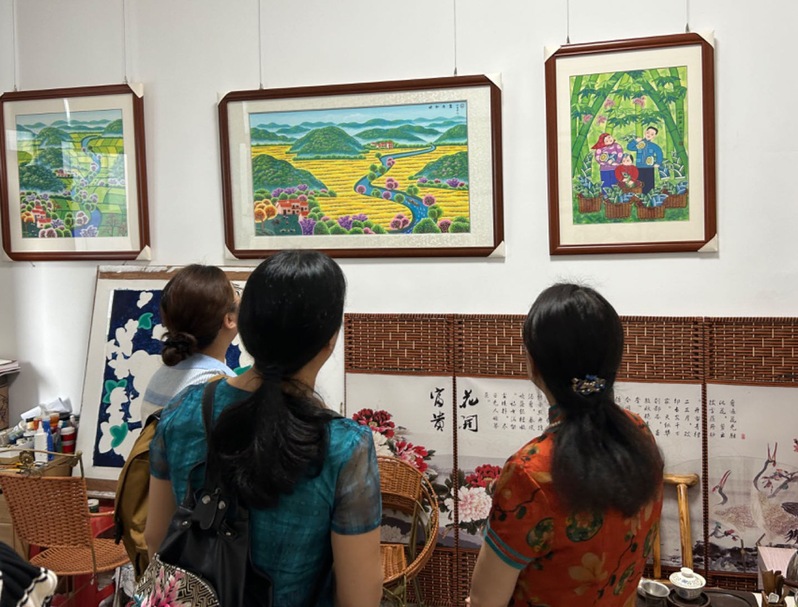 随后,一行人来到龙门县文化馆,实地感受龙门县历史文化底蕴和人文发展成就。马院教师重点参观了龙门农民画展厅与农民画画室。龙门农民画起源于清末,是广东省的传统民俗绘画艺术,被誉为“岭南艺术奇葩”,它继承了传统的民间艺术形式,以岭南民俗为特色,用色彩明艳的画风描绘乡土气息的风情、民间习俗。党员们现场欣赏着一幅幅色彩鲜艳、生机蓬勃、富有视觉冲击力的农民画精品,倾听着优秀农民画艺术家骆雪芳女士讲解的龙门农民画的历史、特色和构图,感受着农民画创作者们自由奔放的心灵创作、浓郁的乡土风情以及独特的艺术魅力和审美情趣,了解画纸上的匠人、了解非遗,坚定“四个自信”,弘扬中华优秀传统文化,增强实现中华民族伟大复兴的精神力量。