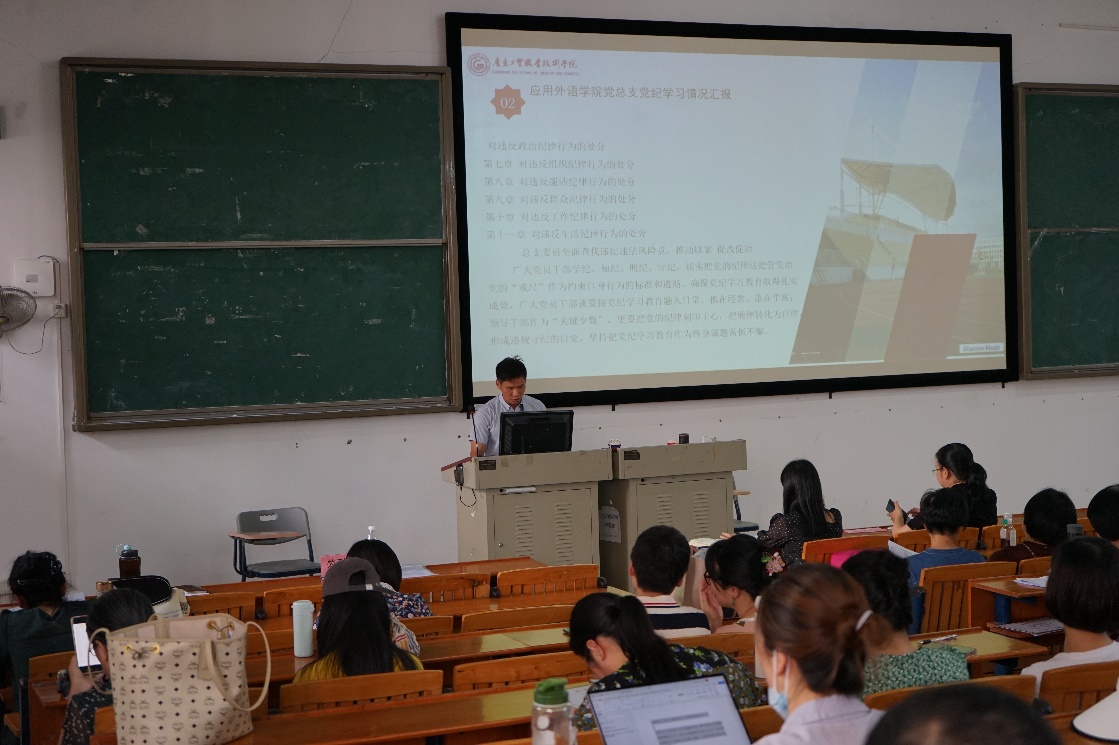 7月9日,应用外语学院党总支在白云校区明德楼2-305召开全体教工党员大会。外语学院党总支临时负责人罗春科,院长彭枚芳及全体教职工党员参加会议。本次会议由罗春科主持。