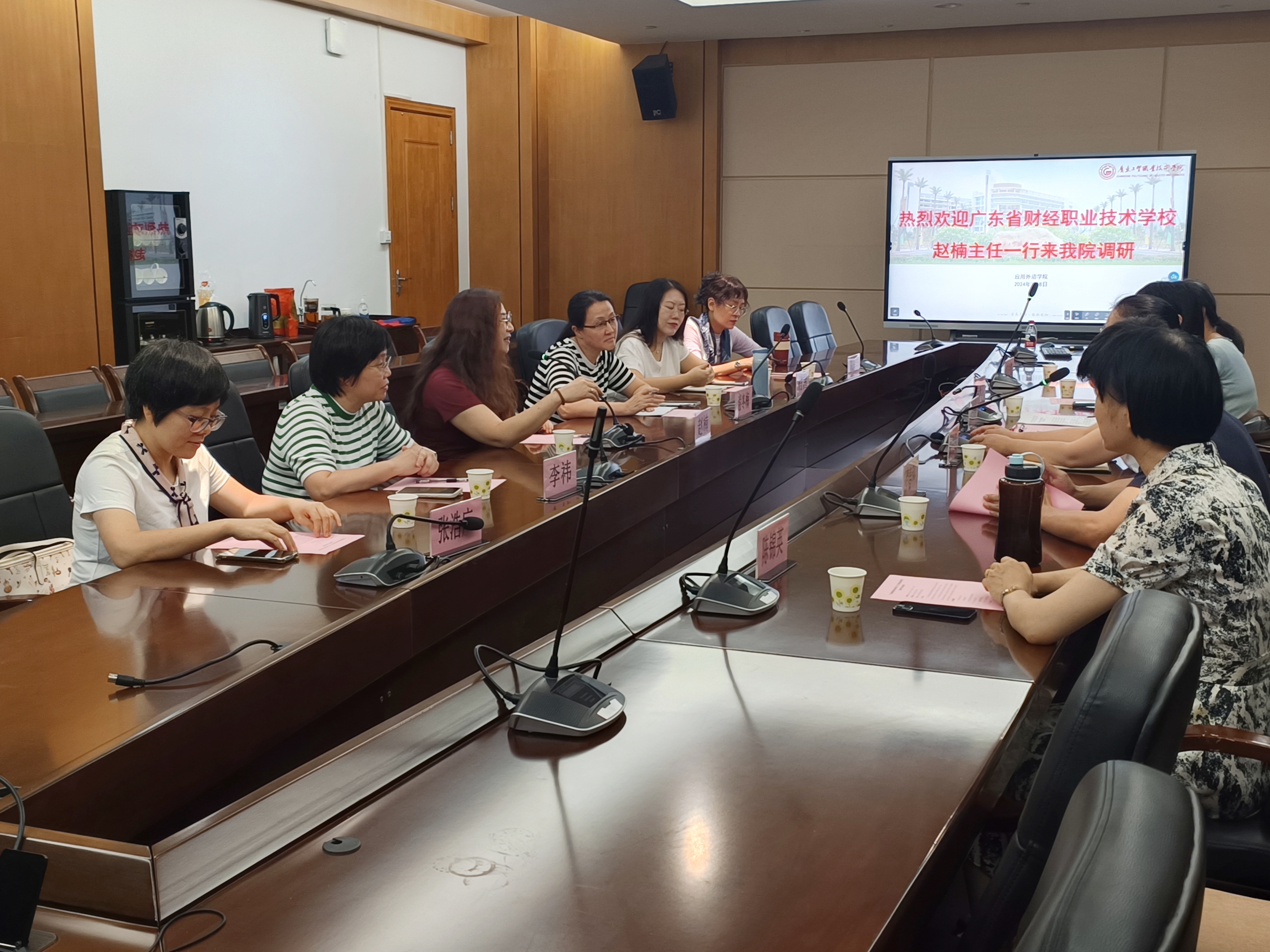 交流过程中,彭枚芳向来访的老师们详细介绍了应用外语学院的发展历程、商务英语专业雄厚的师资力量和近年来取得的不俗成绩,以及学院在开展中高职贯通培养、高本衔接方面的具体案例和成功经验。赵楠主任重点介绍了广东省财经职业技术学校的师资背景、学生特点、专业设置、课程体系等内容。