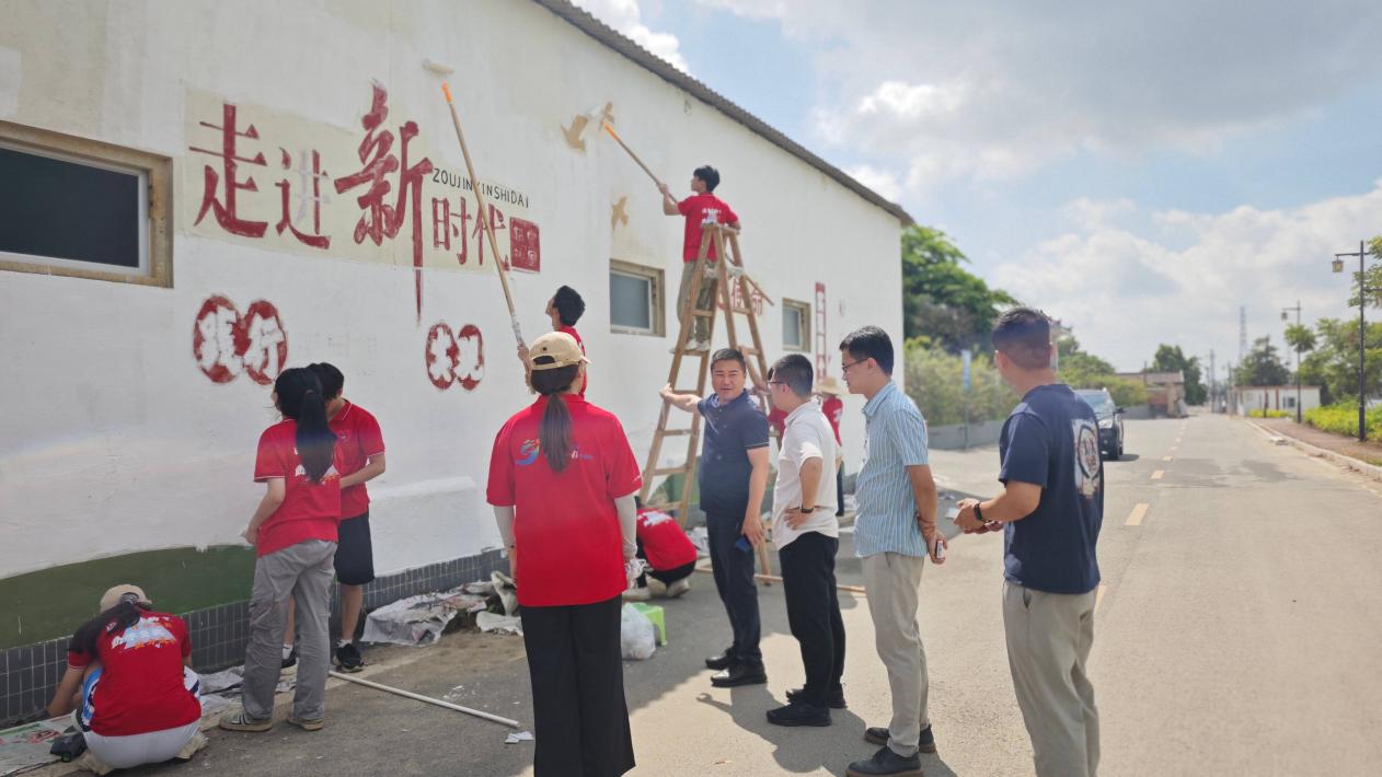 上午十点,隆都镇党委书记魏思超、副镇长李沫彦一行专程前来慰问红星突击队的队员们。他们不仅关心队员们的身体状况,还强调了安全作业的重要性,表示镇政府和村委会将全力支持红星突击队的工作,为他们的实践活动提供必要的帮助和保障。这份来自政府的关怀与支持,让队员们倍感温暖。烈日炎炎下,突击队员们连续奋战近五个小时,汗水浸湿了衣背,却无一人言退。面对天气预报中的雨云,他们更是争分夺秒,只为在雨水到来前完成墙面的底色填充。这份坚持与毅力,正是青春最美的注脚。