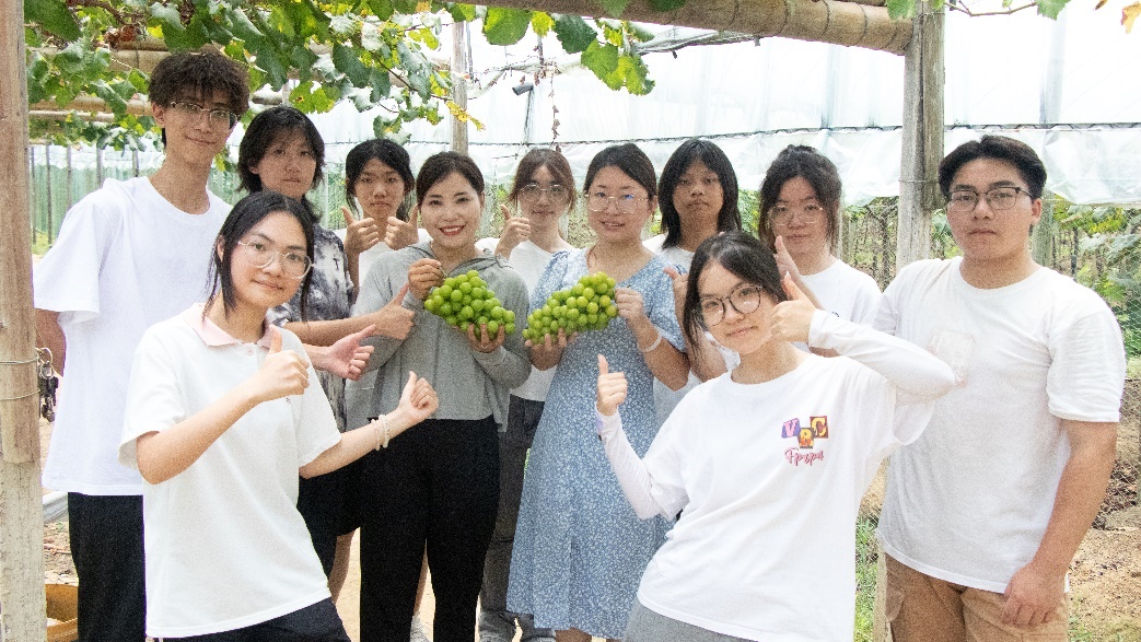 “乡约同行”实践队与园主许姐在葡萄园合影留念