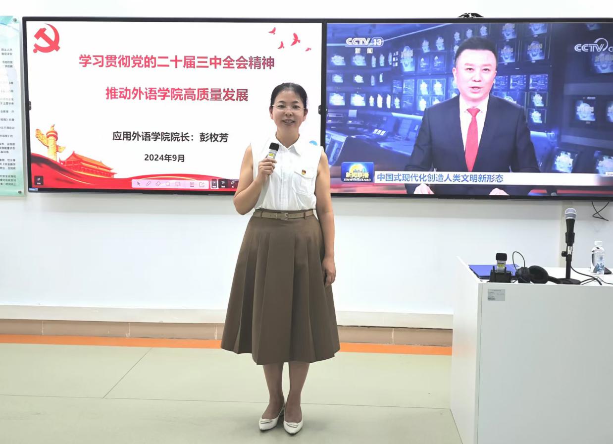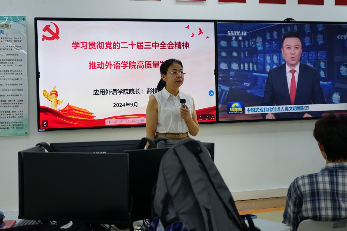 为学习贯彻党的二十届三中全会精神,推动外语学院高质量发展, 2024年9月19日,应用外语学院院长彭枚芳在行知楼609面向2024级新生上了思政第一课。