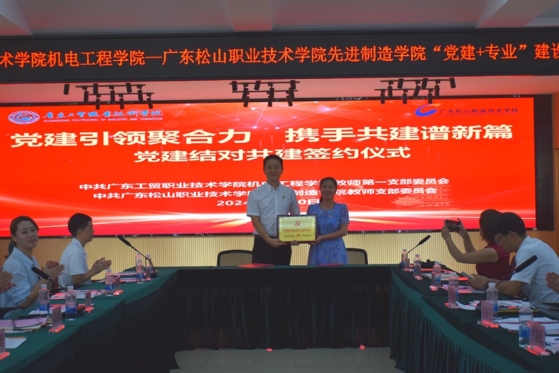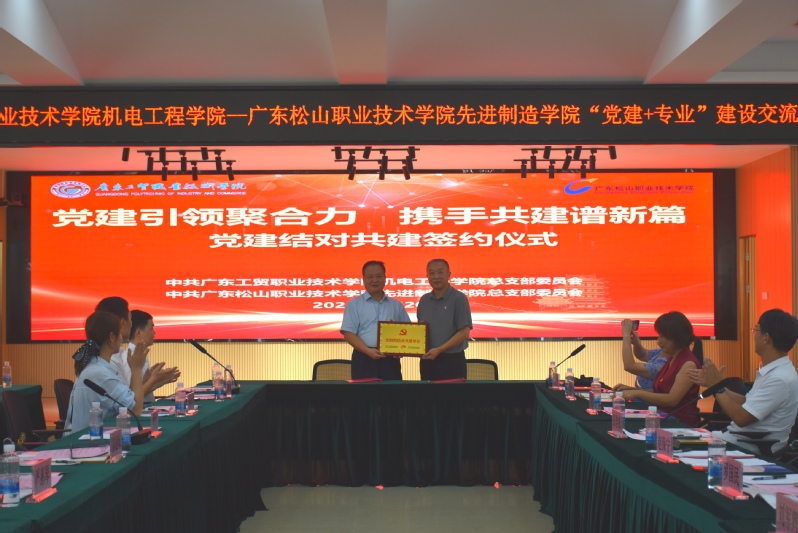 随后,进行党建结对共建签约仪式。中共williamhill威廉希尔官网机电工程学院总支部委员会和中共广东松山职业技术学院先进制造学院总支部委员会进行结对共建签约,中共williamhill威廉希尔官网机电工程学院教师第一支部委员会和中共广东松山职业技术学院先进制造学院教师支部委员会进行结对共建签约。