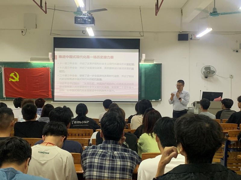 课上,罗庚兴通过列举西方国家的现代化的发展方式,向同学们介绍了世界现代化及其发展阶段。通过讲解中国式现代化的鲜明特色,进一步深入阐述中国式现代化的科学内涵。围绕中国式现代化的思想理论,带领同学们回顾中国工业化的艰辛历程和中国式现代化的发展进程,总结概述了改革开放和党的二十大以来党和国家事业取得的重大成就。同时,罗庚兴对党的二十届三中全会精神进行了宣讲,进一步阐述在新时代新征程上,中国共产党坚定不移高举改革开放旗帜,紧紧围绕推进中国式现代化进一步全面深化改革的决心。