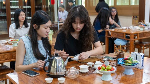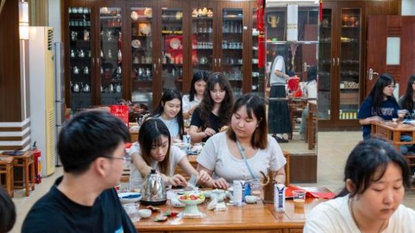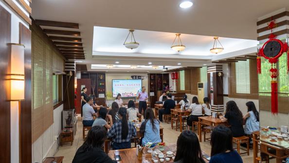 茶话会活动环节,区翠梅老师带领同学们了解红茶的产地与品种,冲泡方法、冲泡器具,并演示了整个行茶过程,让同学们了解广东的茶文化,从而更好的融入广东生活。 同学们全神贯注地聆听老师的讲解,并尝试自己泡茶、品茶,沉浸在喜悦之中。