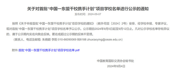 据悉,2023年9月,国务院总理李强在印度尼西亚雅加达出席第26次中国东盟(10+1)领导人会议时提出“中国-东盟千校携手计划”倡议,后该计划纳入《东亚合作领导人系列会议合作倡议清单》。该计划是在教育部国际合作与交流司精心组织下,响应构建更为紧密的中国——东盟命运共同体,服务共建“一带一路”倡议的重要举措。