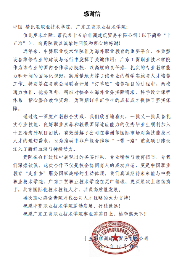 2024年,威廉希尔官网与十五冶联合落地非洲首个重型设备维修定向培养项目,首届60名学生2025年顺利毕业,45人入职十五冶企业,15人获企业资助继续深造。该订单班以“中文+技能+岗位”模式破解中资企业属地化用工难题,成为职教出海典范。十五冶在信中提及将启动第二届订单班,计划资助50名赞比亚青年,期待与两校深化合作,共促中赞职教与经贸发展。