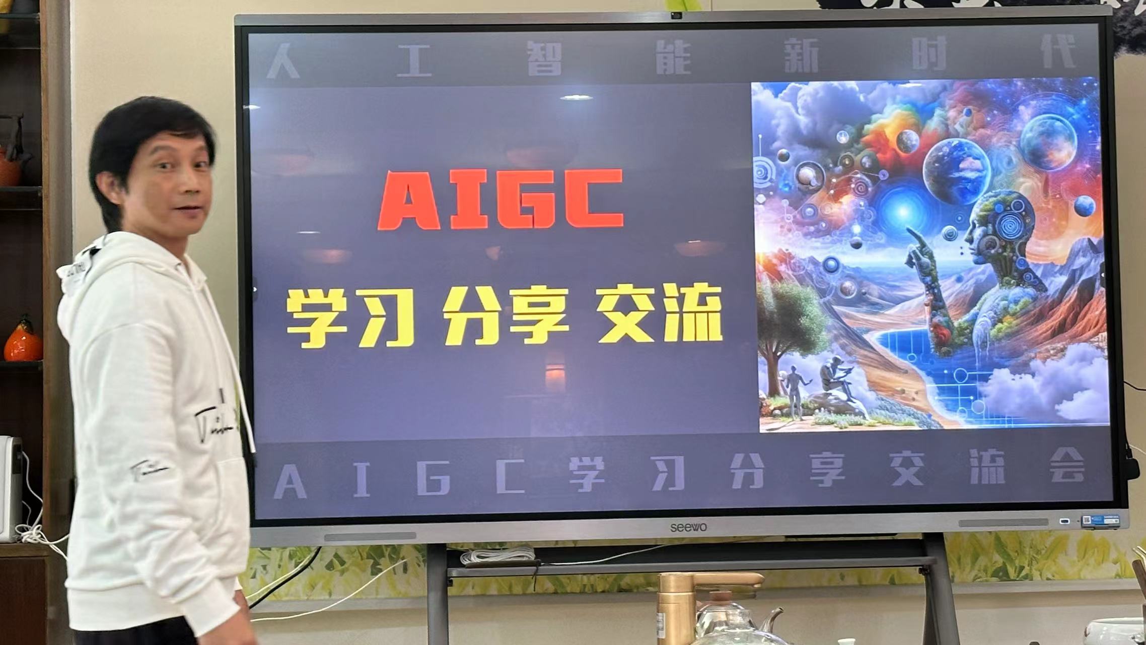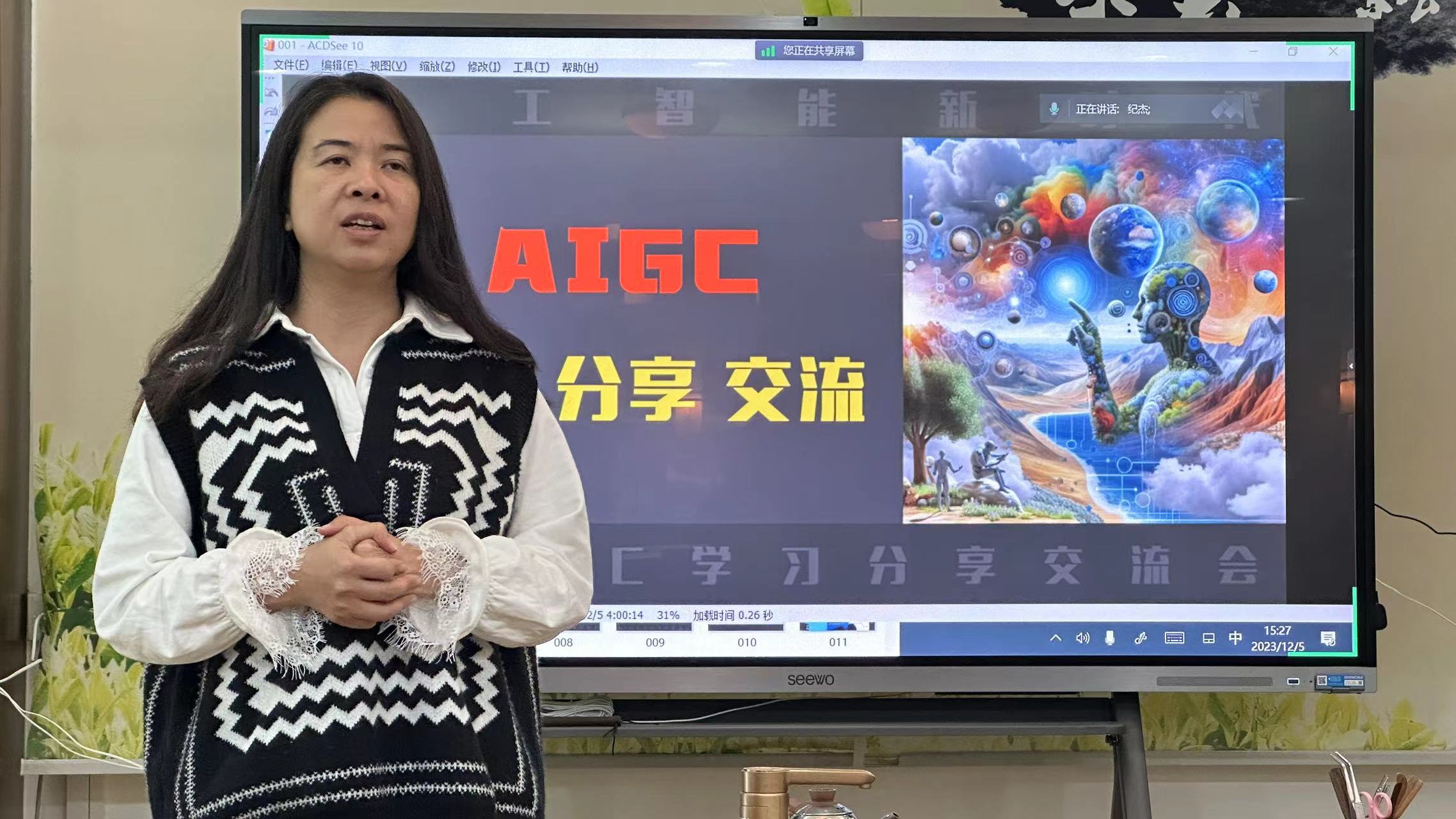 会议由吴志忠老师向大家分享参加“AI人工智能对教学的应用”的培训收获。吴老师分享了此次培训的内容,重点探讨AIGC创作人才培养新模式,同时对高校艺术类人才培养的着重点做了很好的解读,指出由于人工智能的出现,对我们的专业课程设置、专业教学提出了新要求。